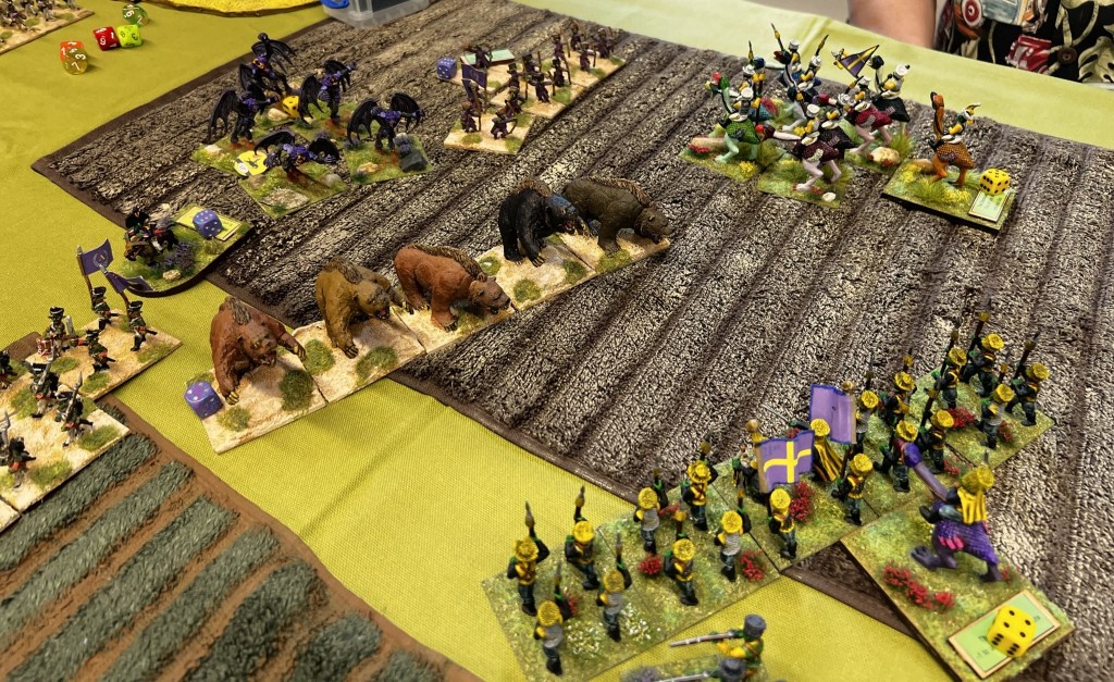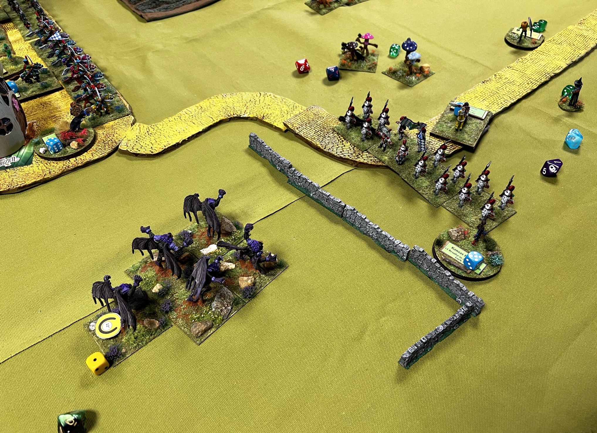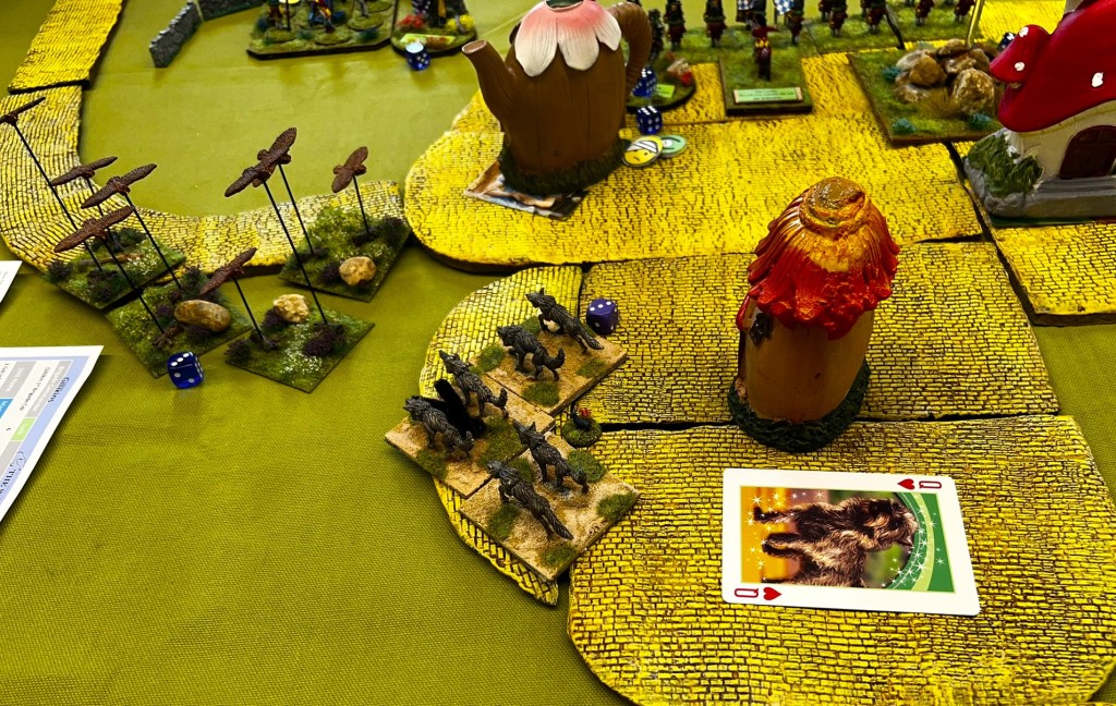Once again, at the start, witch sibling rivalry took over – though this time it was the Gillikin’s Dire Bears hitting first instead of the Winkies. And once again dice rolls favored the Gillikins and saw the Winkie Cavalry being routed and ultimately driven off of the board! (As Boston Bruins fans know – don’t poke the bear). Also, that cavalry rout went through several other Winkie units, disordering them and slowing their initial movements in the game.