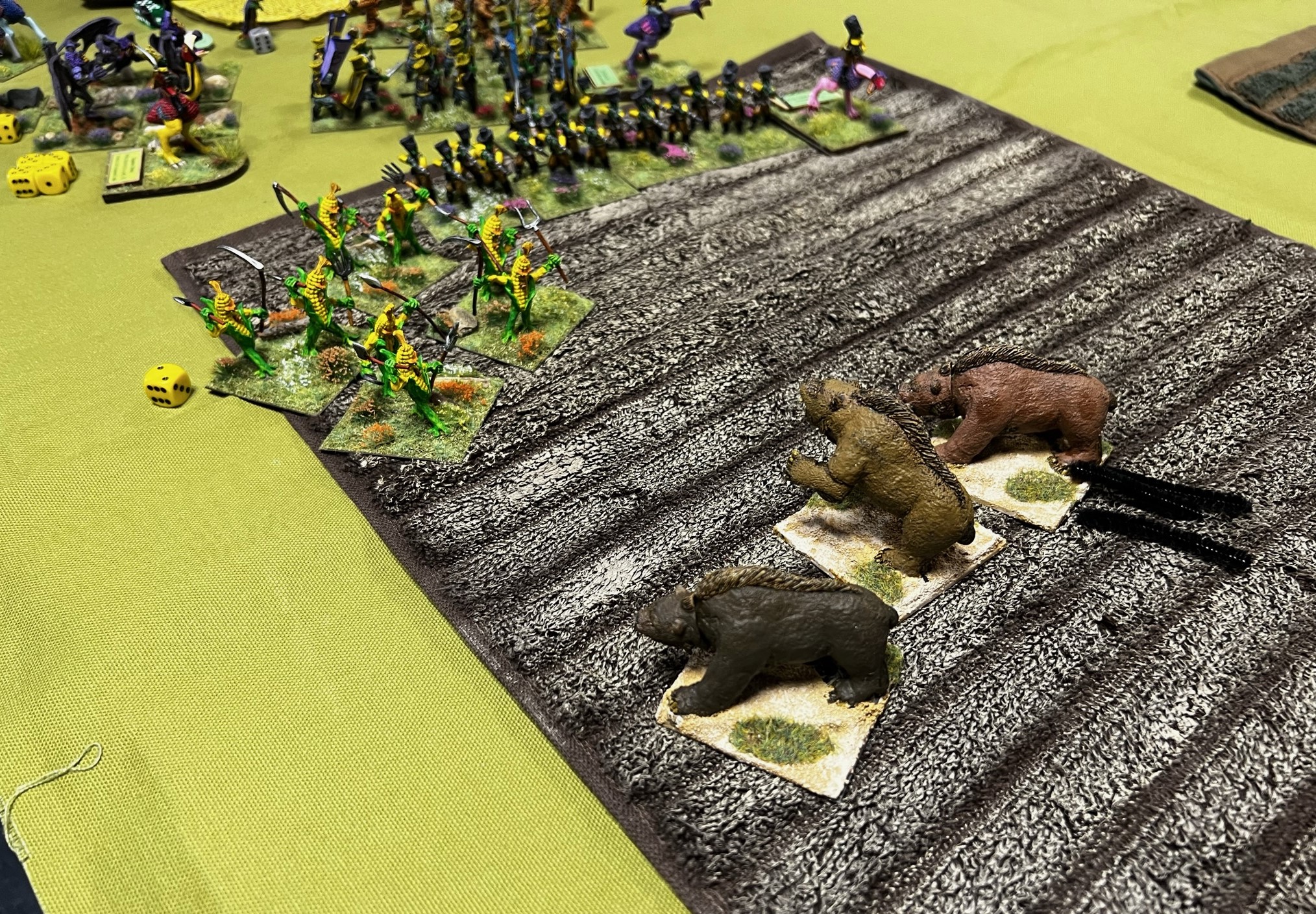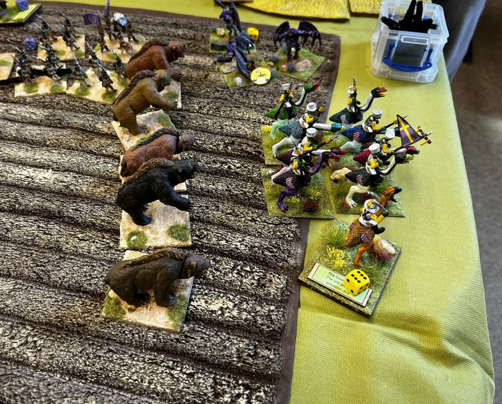 This move also left open the cavalry’s flank, and the Dire Bears subsequently hit them on that flank. In short order, after a few rounds the Winkie cavalry was routed by the Dire Bears and was eventually driven off the board. The loss of this key unit would haunt the Winkies, but now there was definitely a 3-way fight on the tabletop.