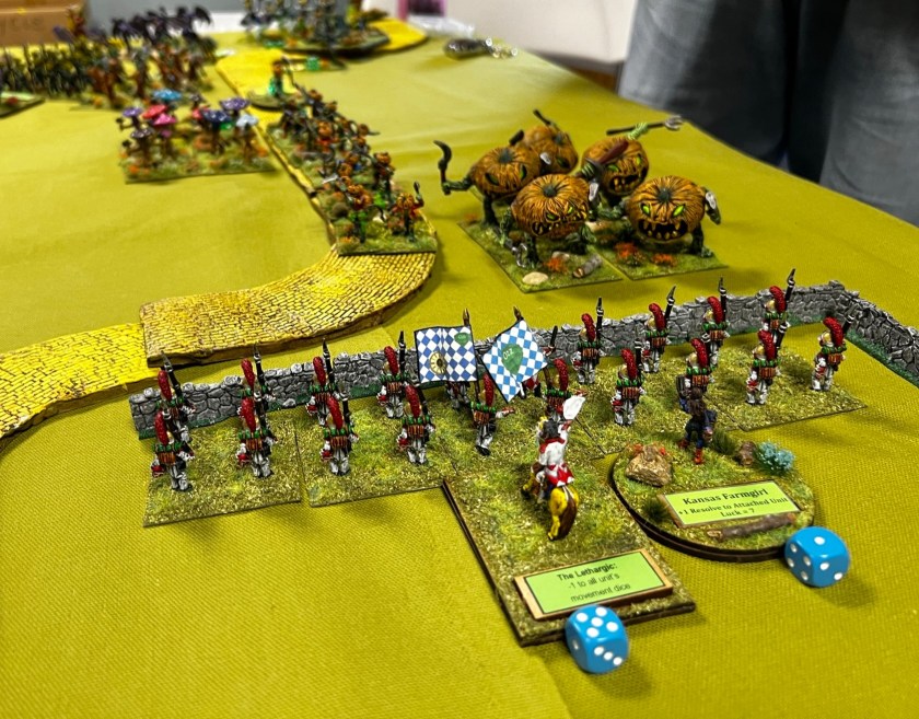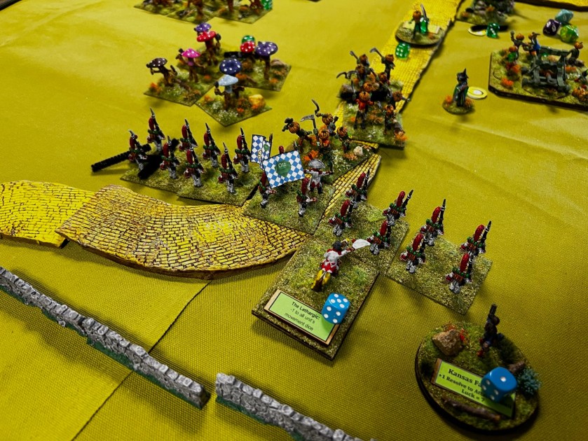 The Harvestland Artillery activated, and hit the Munchkins, eliminating yet another base, and routing the unit. Alas, the Kansas Farmgirl also took damage, and yes, again, sadly bought the farm…