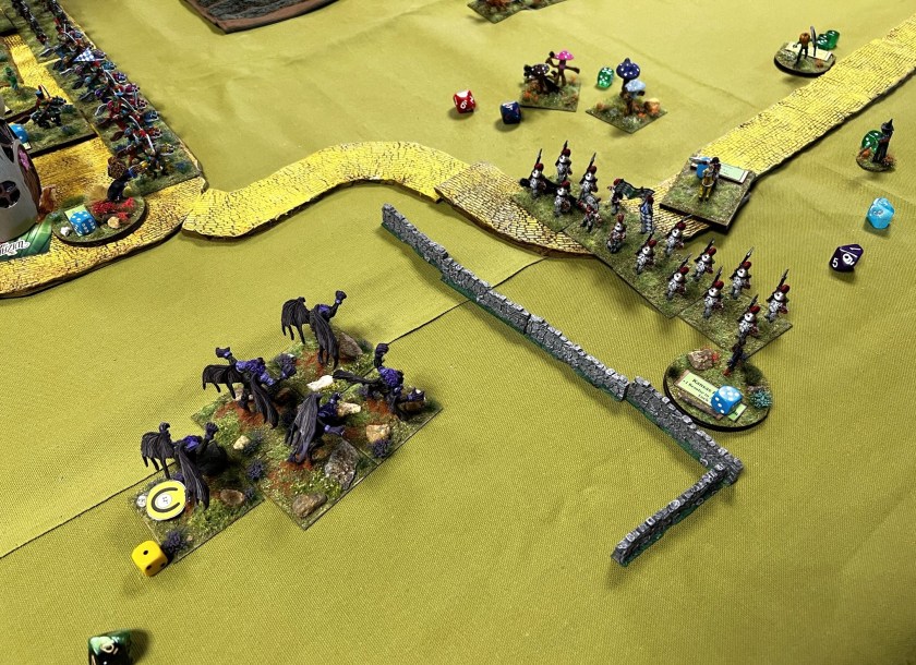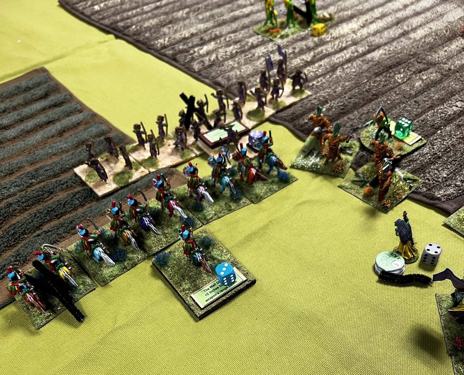 The Munchkin cavalry then took a reaction test, which made them continue to attack the nearest unit – which ended up being the Gillikin Longbows. The bowmen damaged the cavalry and broke up their attack with little damage. Subsequently, Evora successfully hit them in the rear with a fireball, taking out a base. A terrible Reaction test die roll then sent the Munchkin Cavalry fleeing.