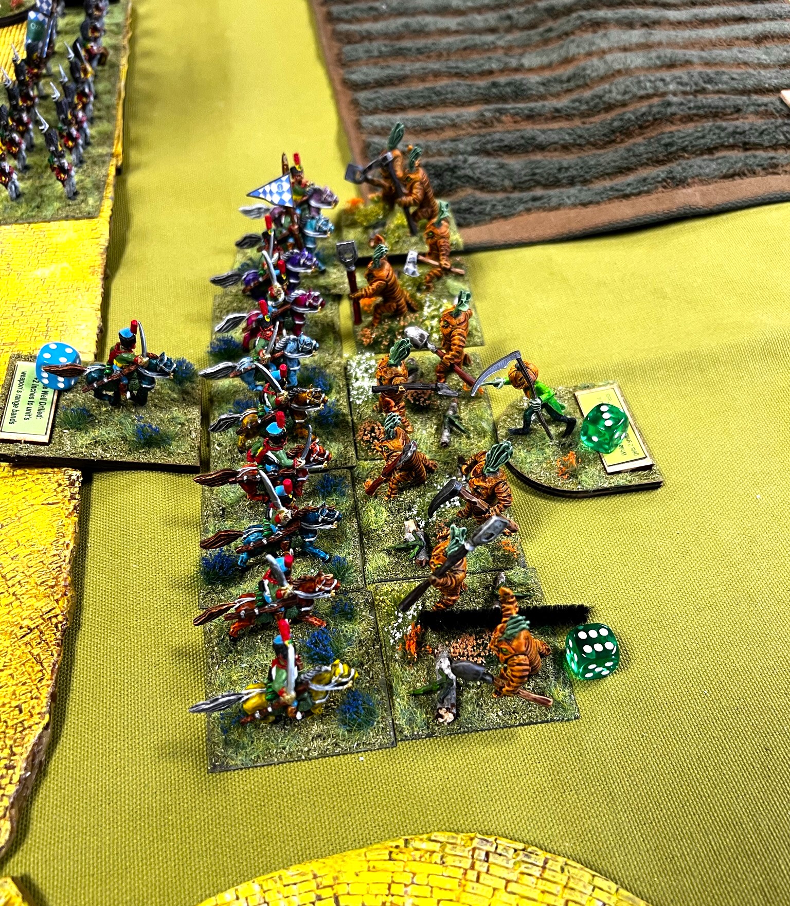 The Carrot Creatures decided to fire their bows at and then charge the Munchkin Light Cavalry. The Munchkin Light Cavalry’s Reaction test to that fire dictated that they would countercharge the Carrots – with impetus and double hits…the result was massive damage to the Carrots, who also quickly fled the battlefield in a hurry.
