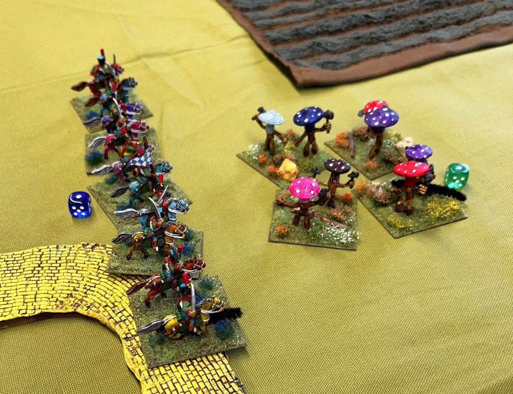 At the town, the Munchkin Aerostat kept up covering fire from a safe location, as Harvest melee troops hit the defenders in waves. One such attack triggered the Munchkin Light Cavalry to charge out of the town and hit the Mushroom Regiment.