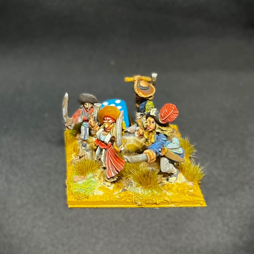 The fourth base has three Munchkins (the converted Ral Partha “Female Halfling Fighter Thief” #11-102 (b) figures) and the unknown Gillikin figure.