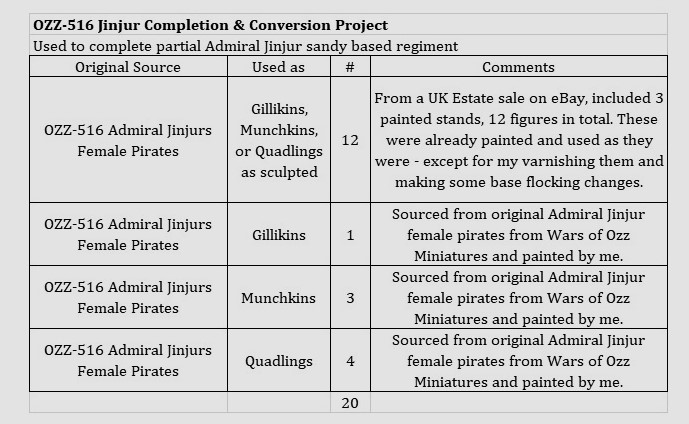 As you can see from the chart above, six of the figures in this AJFP regiment were original OZZ-516 Wars of Ozz figures. They would primarily go on two bases – one with 4 Winkies and one with 4 Gillikins.