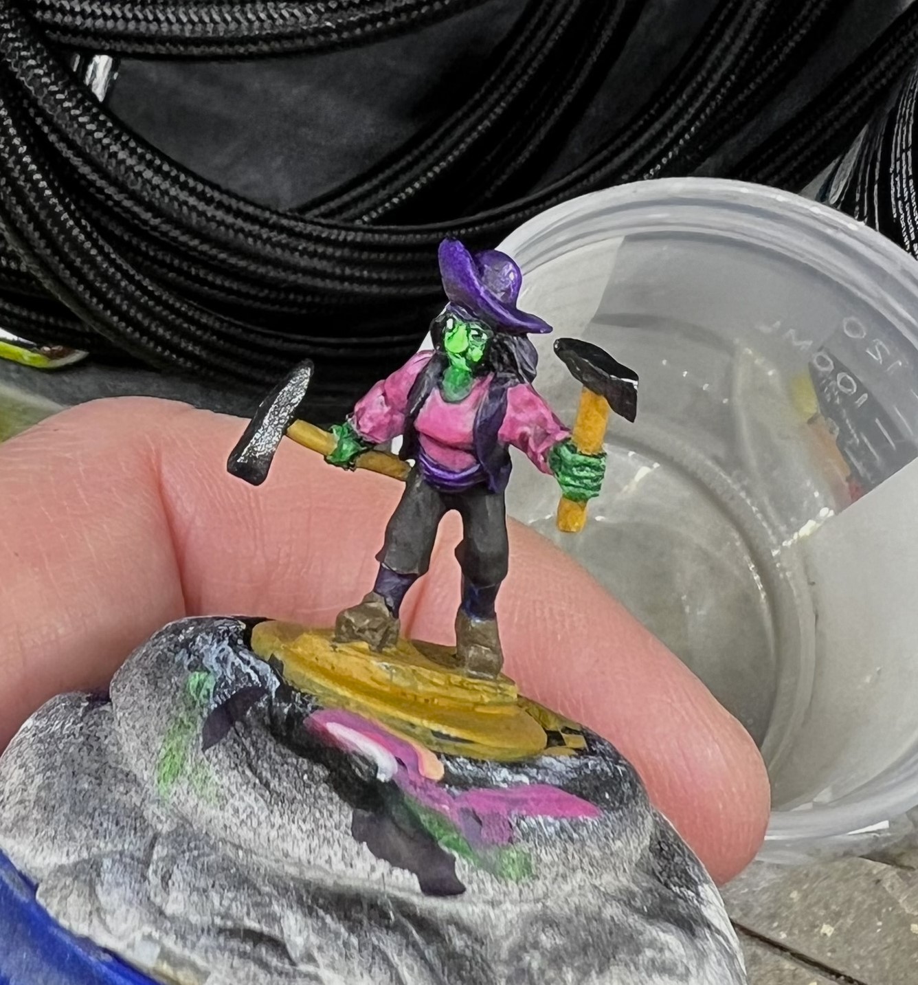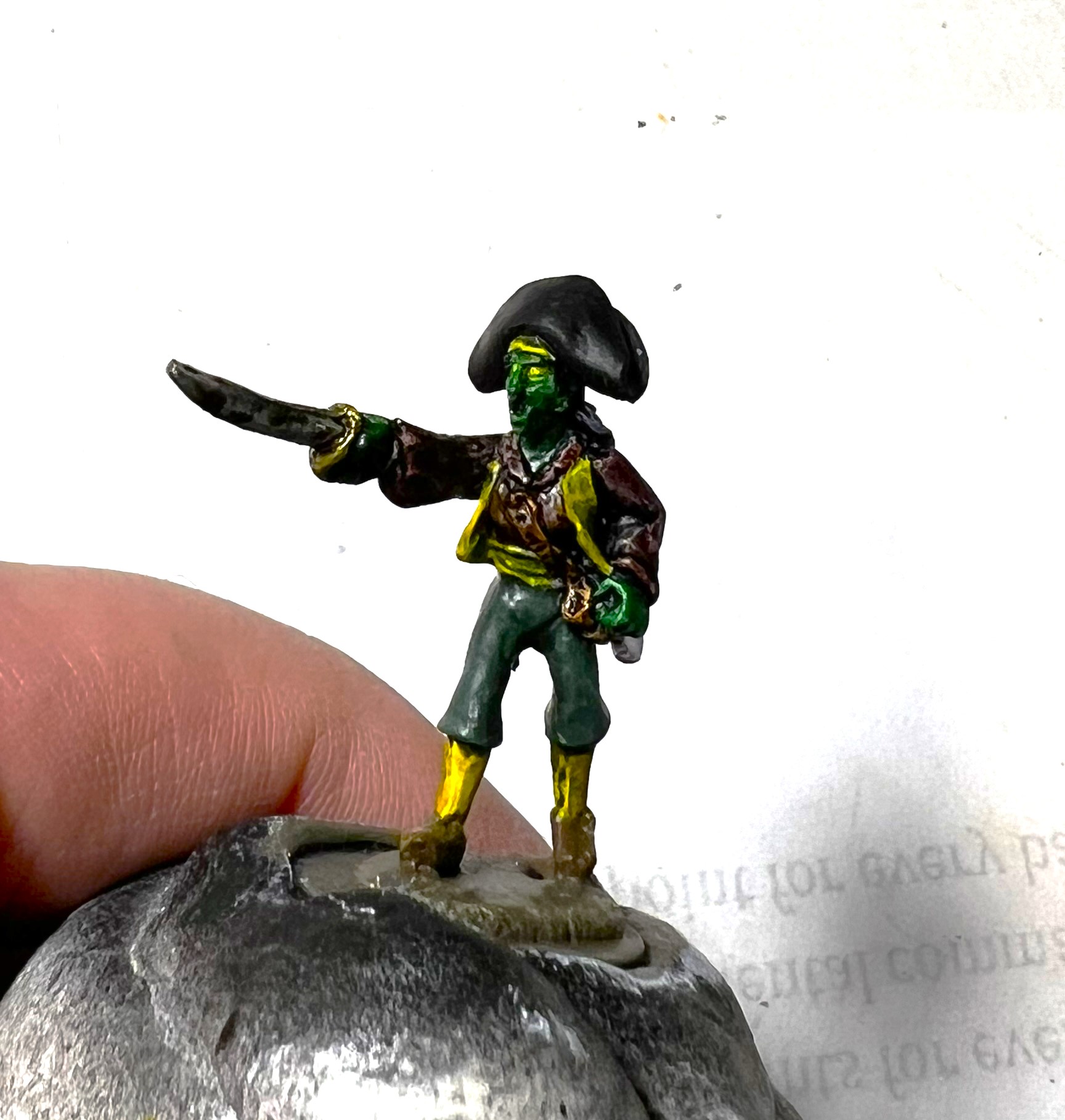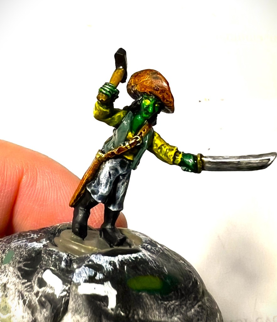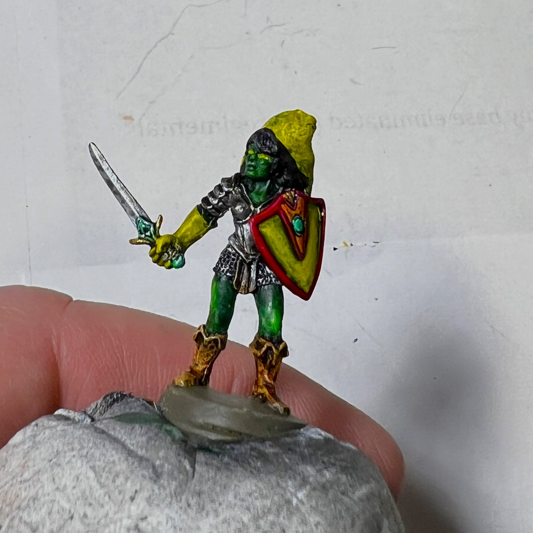 Needless to say – she is not a necromancer. Her base had FA-19 on it, which allowed me to dig deeper and find her image here. The figure is actually FA-19 V2 “Female Fighter with Breastplate and Sword”. She was sourced from Citadel Miniatures US FA-19 (v2) from “Fantasy Adventurers” line circa 1982. From what I can tell, similar to Ral Partha Imports, this brand was either manufactured or imported by Ral Partha in the 1980’s. I modified the figure with a bicorn hat. As I thought she looked more as if she was wearing a tunic versus a breastplate – I painted her accordingly and as a Gillikin.