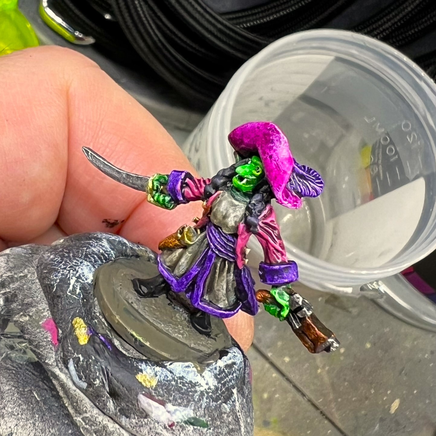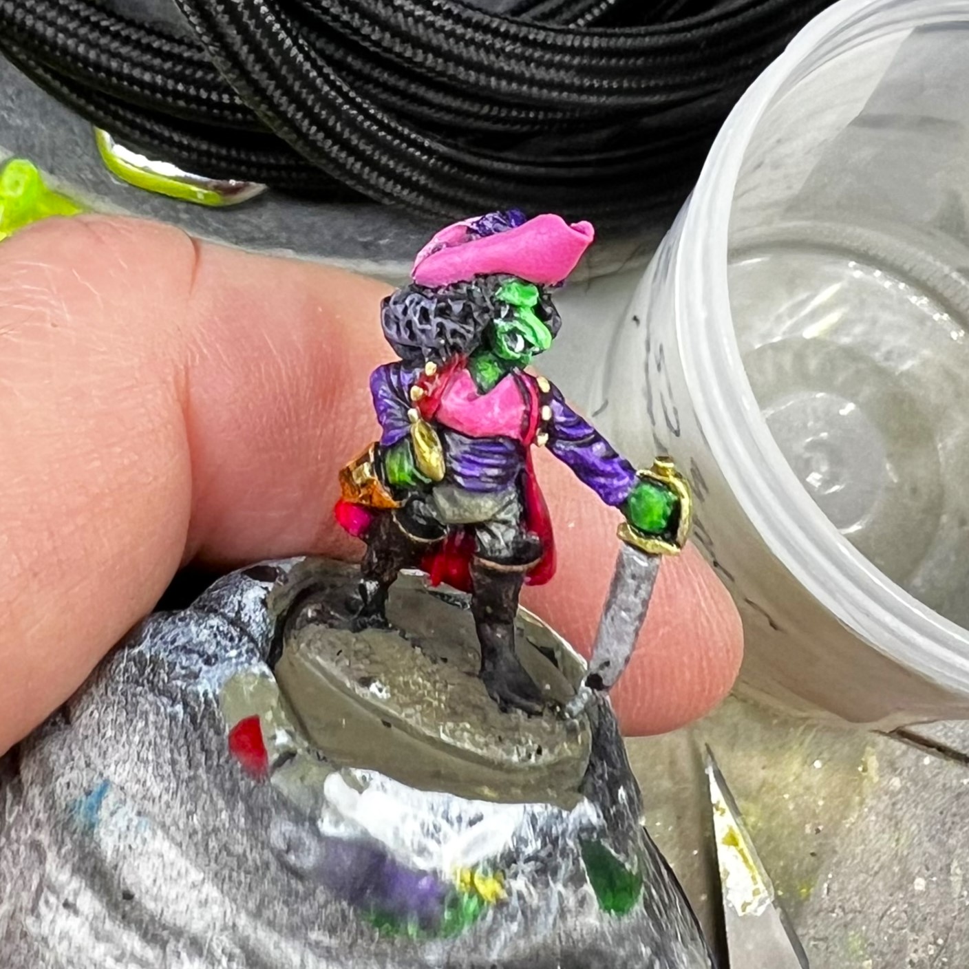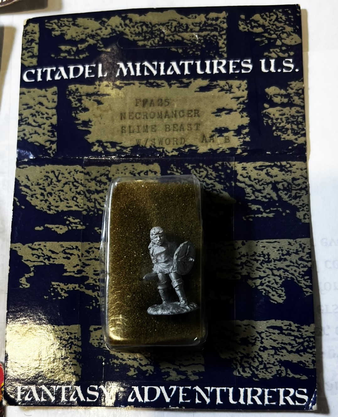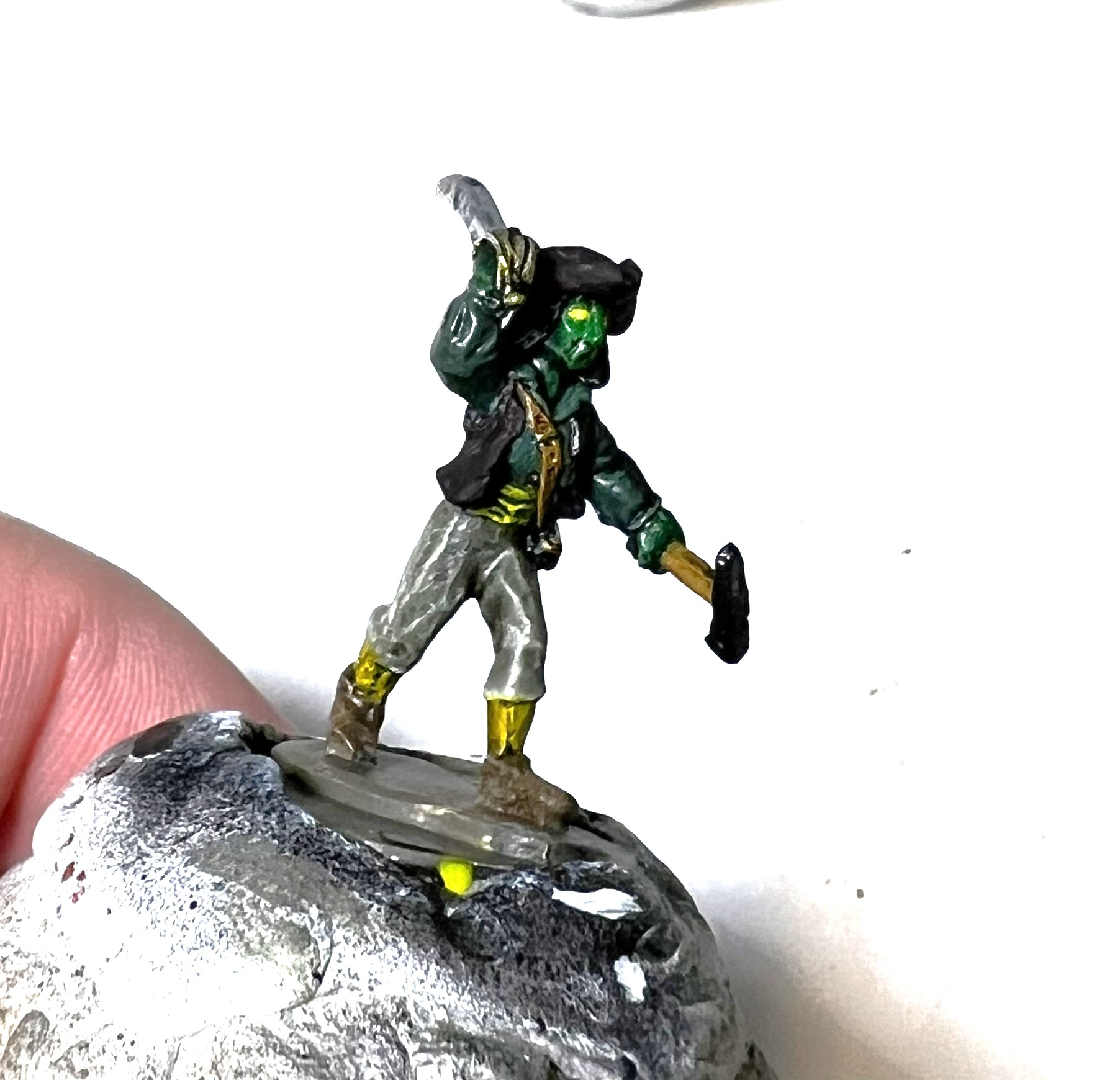 Needless to say – she is not a necromancer. Her base had FA-19 on it, which allowed me to dig deeper and find her image here. The figure is actually FA-19 V2 “Female Fighter with Breastplate and Sword”. She was sourced from Citadel Miniatures US FA-19 (v2) from “Fantasy Adventurers” line circa 1982. From what I can tell, similar to Ral Partha Imports, this brand was either manufactured or imported by Ral Partha in the 1980’s. I modified the figure with a bicorn hat. As I thought she looked more as if she was wearing a tunic versus a breastplate – I painted her accordingly and as a Gillikin.