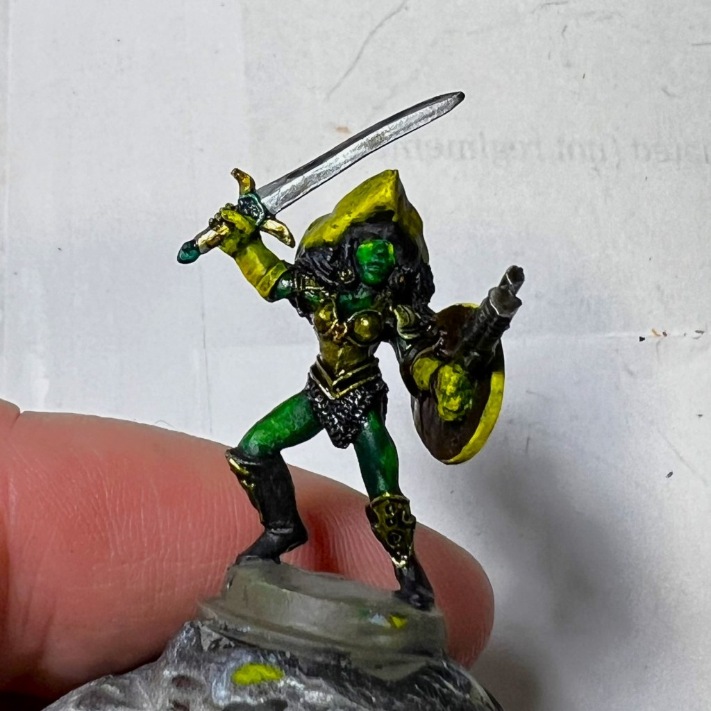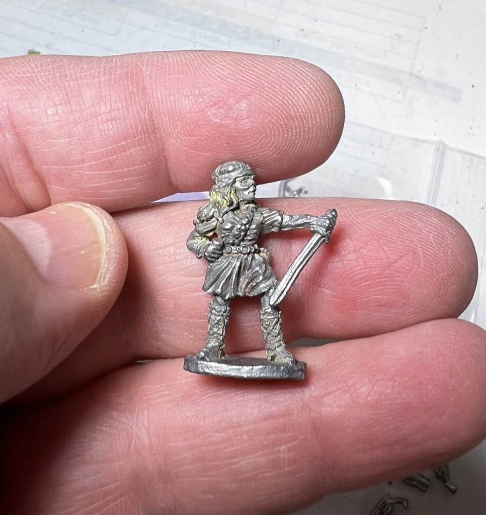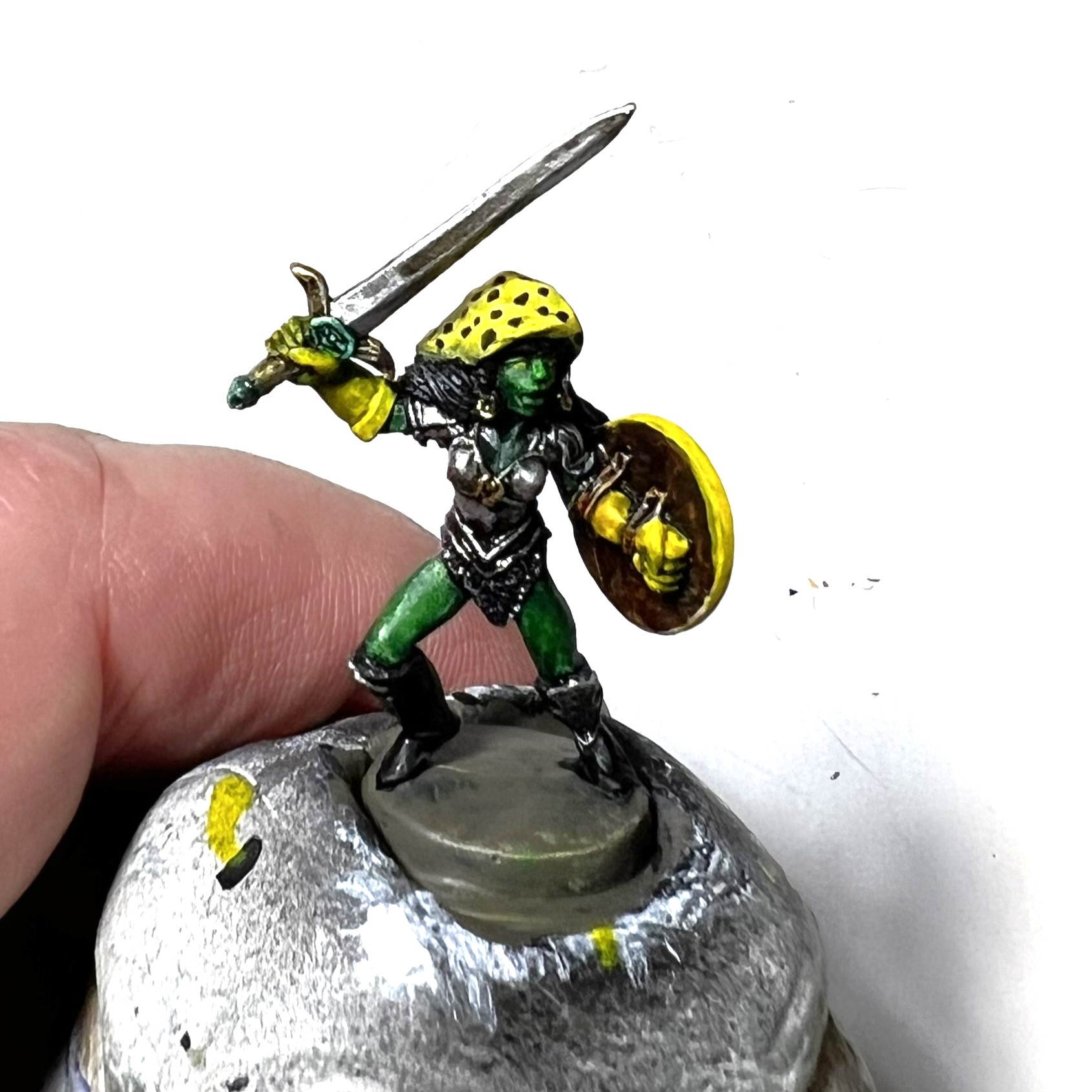 The next one was to be a Gillikin. She is an Amazon figure originally sourced from Ral Partha Imports Fantasy Adventurers Series – FA-27 “Amazon with Sword” – from 1986. Back in the 1980’s, Ral Partha imports took Citadel figures and marketed them in the US under licence. I made her a Gillikin and left her alone – except to give her a purple shield. Maybe it was her chain mail bikini…