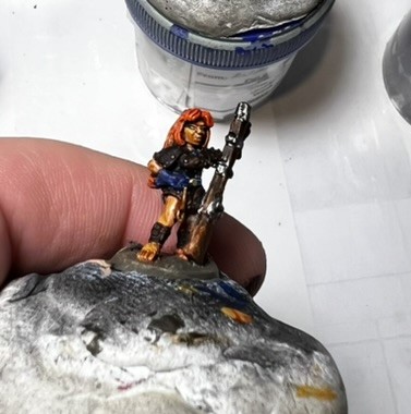 The penultimate figure in the group of draftees was a RAFM figure of a female ranger and her hawk on her right arm. It appears that the figure was initially sculpted around 1986. Many RAFM figures (including this one) are still commercially available as Silver Fox Productions (SFP) now owns the RAFM lines. I sourced it from RAFM at some point maybe 8 years ago. It is RAFM Miniatures#3908 “Female Ranger”. I gave her a bandana and painted her as Winkie.