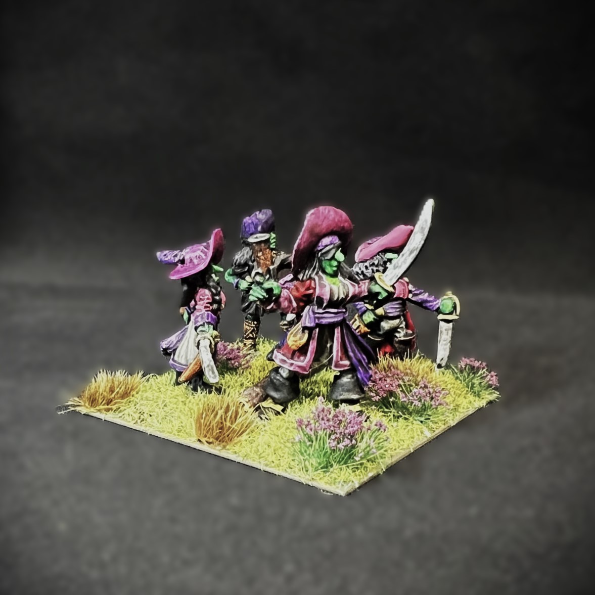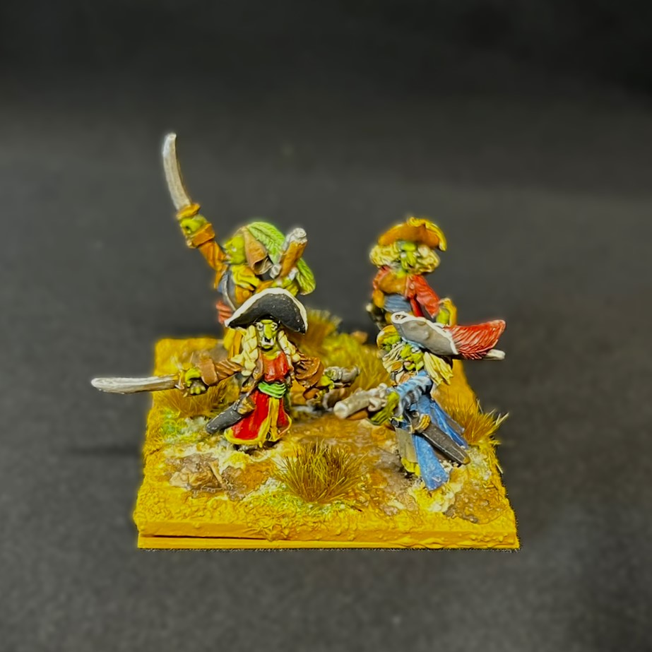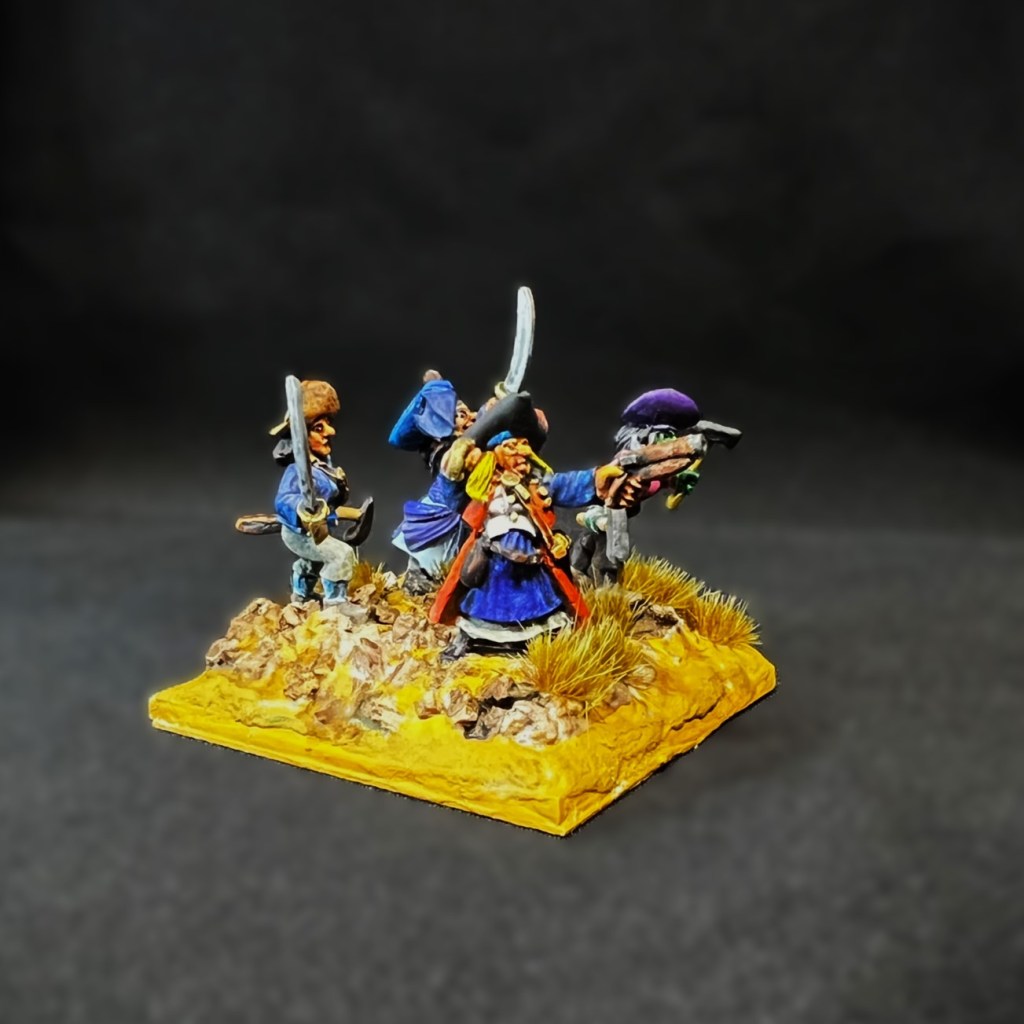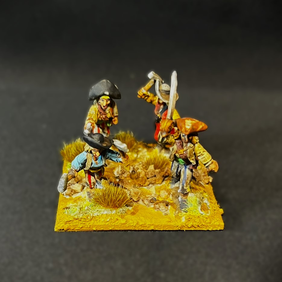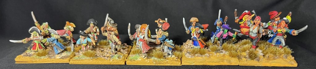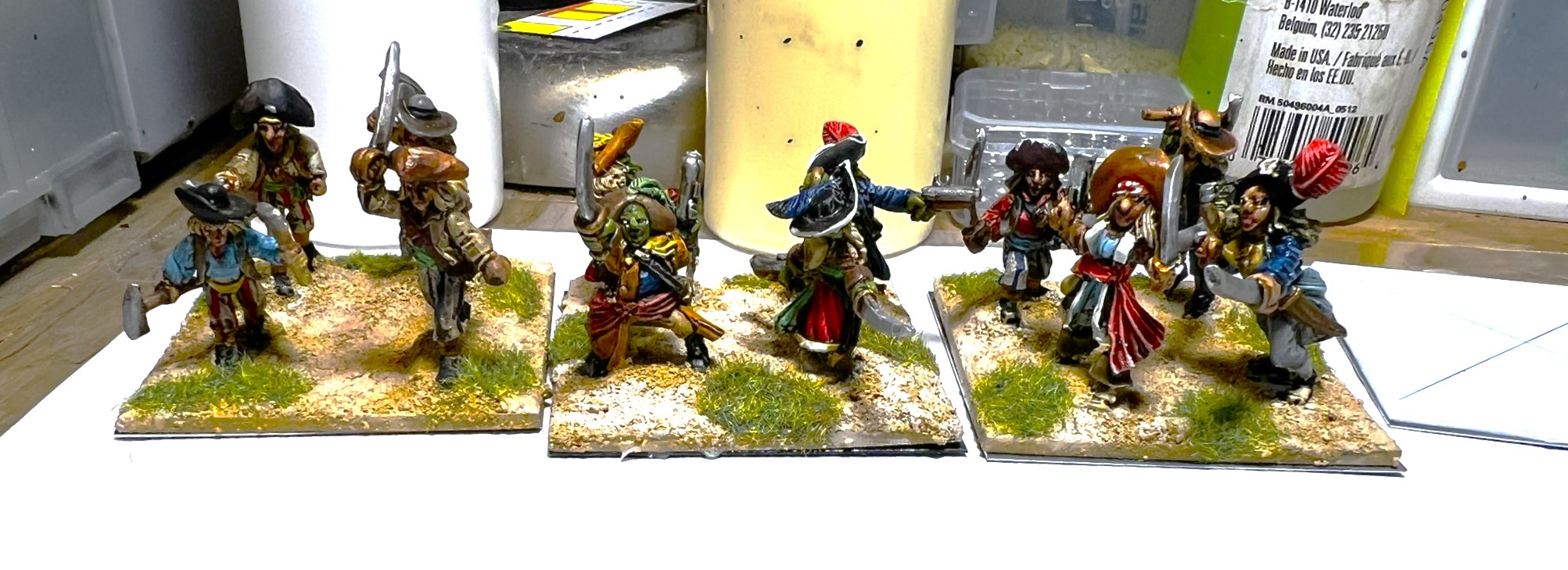 I gave these warriors hats and pistols, plus I bent a few swords to look like cutlasses. My sculpting efforts here as I said are not great – and I learned to my chagrin that using old green stuff with the consistency of used hardened bubblegum (like from under a desk) is NOT what you want to use. Still, I used all as female Winkies due to their poses and sizes.