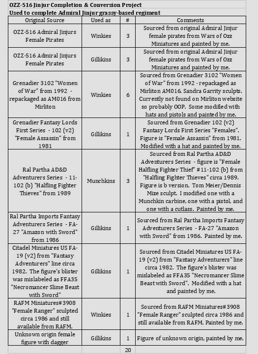 Because I participated in the Kickstarter for Ozz a few years ago, I got a bonus of 4 of these figures for Admiral Jinjur’s Female Pirates (AJFP), SKU #OZZ-516 with my initial order. Later, when I bought a number of Gillikin-affiliated Ozz units from a UK estate sale – I was surprised to see that three fully-painted stands of AJFP had been thrown in the shipment. This left me with a need for another just 4 figures to round out the group for a full regiment of 5 stands/20 figures. Russ Dunaway was kind enough to get me not just 4, but 10 more – which if you are doing the math added up to 4 (Kickstarter) + 12 (estate sale) + 10 (Russ) = 26! Now, I could have said, ok, that’s enough for 20, but part of me decided to push the envelope for two full regiments. Rather than beg Russ again, I decided to roust out from my lead pile 14 Old School female warriors – mainly Amazons, halflings, and female fantasy types, and convert them into appropriate AJFP’s. These would be 25mm Ral Partha, Citadel, Ral Partha Imports, RAFM, and Grenadier figures, that were 30-40+ years old. I would give them new weapons and paint them up as members of the the various Ozz factions and size them to be close to the 28mm originals in terms of faction assignment.
