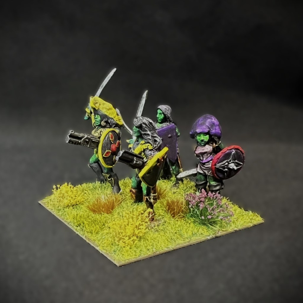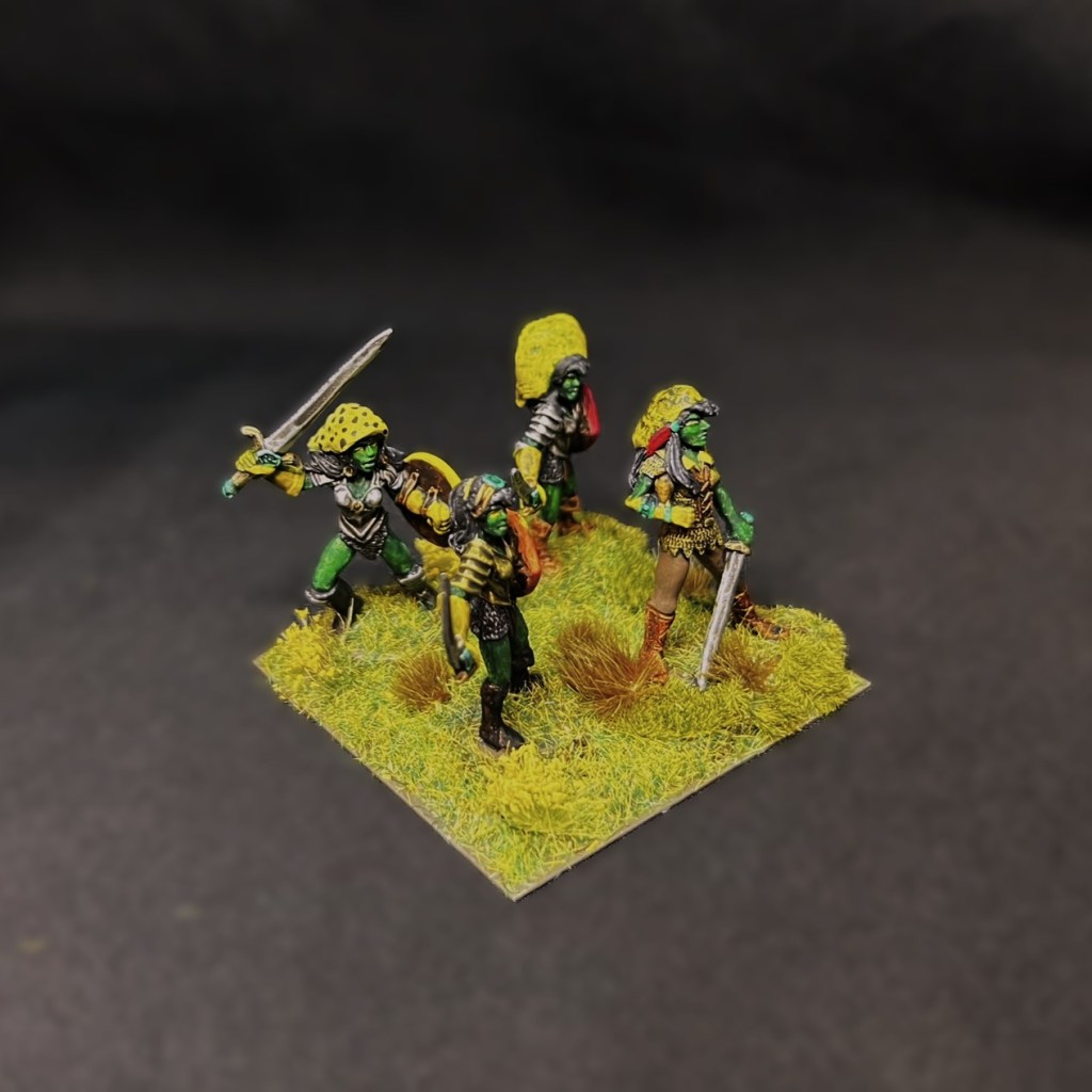 Rounding out the grassy-based AJFP regiment, the fifth base is composed of two of the converted Grenadier “Women of War” figures in the front rank, with two Gillikins in the back rank – the Ral Partha Imports Fantasy Adventurers Series – FA-27 “Amazon with Sword” and the Citadel FA-19 V2 “Female Fighter with Breastplate and Sword”.