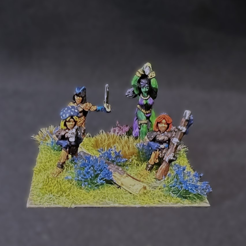 The third base has three of the Grenadier “Women of War” figures and the RAFM Miniatures#3908 “Female Ranger”, all as Winkies.