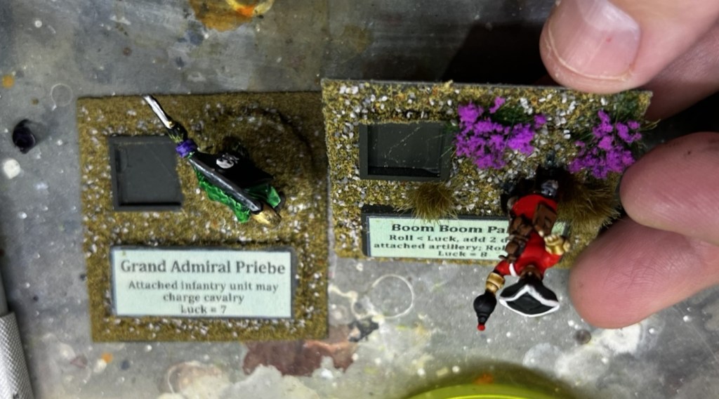 A quick side note: I also got a surprise during the painting of these two regiments. My good friend Buck Surdu sent two more individual figures that can act as heroes in the game. One is “Boom Boom Palmer” (named after Chris Palmer). This figure can attach to an artillery unit and make it more effective. The other is Grand Admiral Priebe, who can give an attached infantry unit the ability to charge cavalry. THANKS BUCK!!