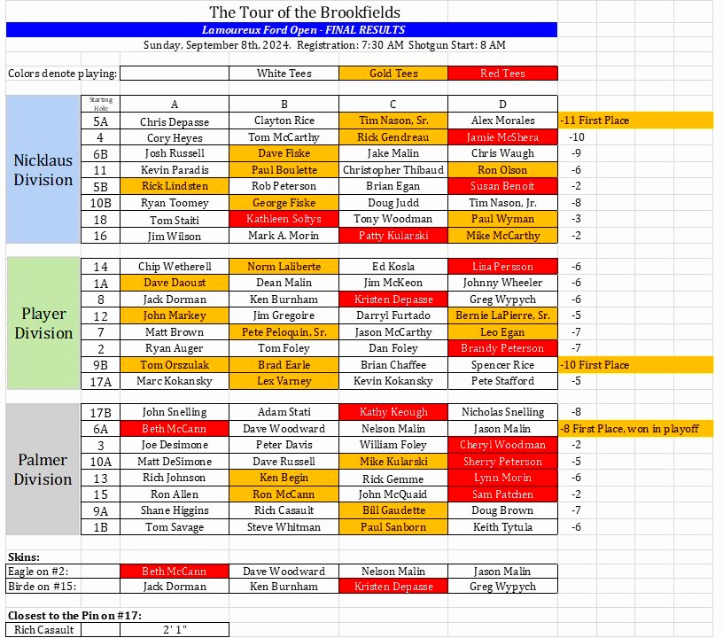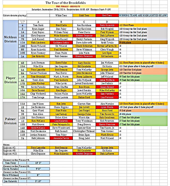 We had our FINALS for the 2024 Tour of the Brookfields season on Saturday, September 28th. It is also called “The Grand Tour“. Each division/flight had 6 teams placing in the prize circle. There were also skins awarded (3) as well as 4 closest to the pins.
