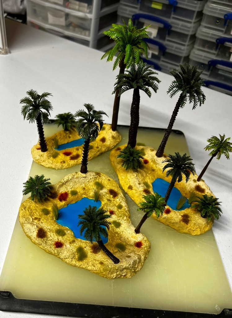 I then mixed and matched the palm trees to see what worked. The cured Apoxie Sculpt was pliable enough – yet strong enough – such that I was able to use an awl to make the holes for the trees’ prongs you saw above to set in the oases. This allows them to be removable, which is a plus, while the holes stay strong for reinsertion of the trees.