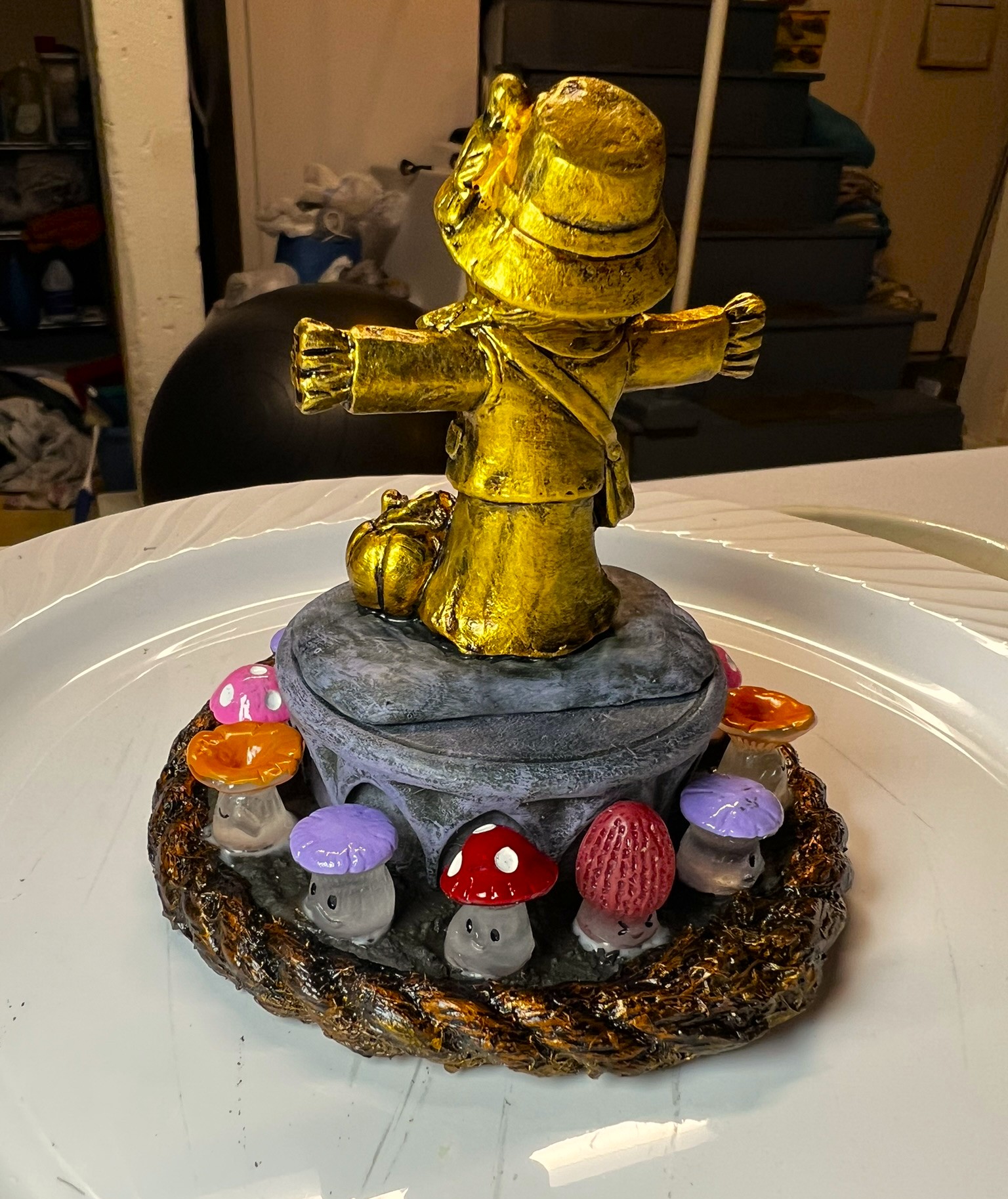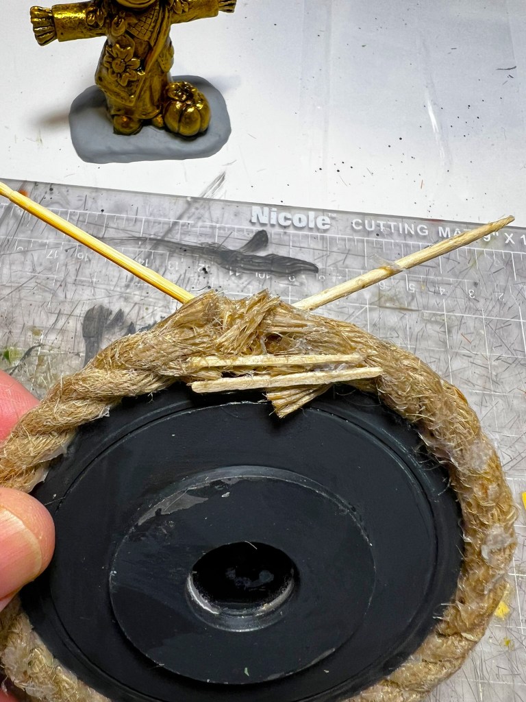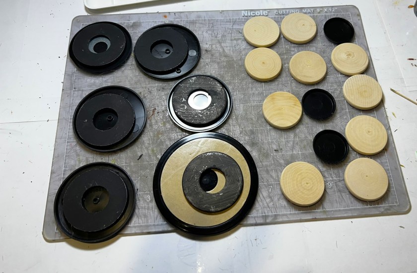 As for bases for the plants, I decided it was a good opportunity to clear out a bunch of different plastic and wooden bases from my collection. One was even the same as I used on the Scarecrow Girl statue. You can see them below – I ended up with 20 bases. All of them got appropriately-sized steel washers underneath.