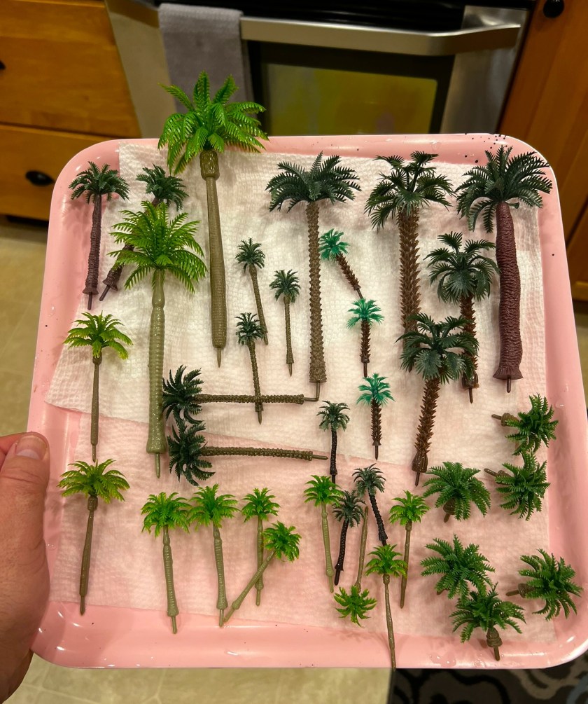 The plastic palm trees would need (similar to the previous situation with the cacti), a sepia wash. To ensure that a sepia wash would adhere properly, I washed all of the palms in soap and water and let them dry. This would also let me figure out what sizes would be best to use on this scratch-build.