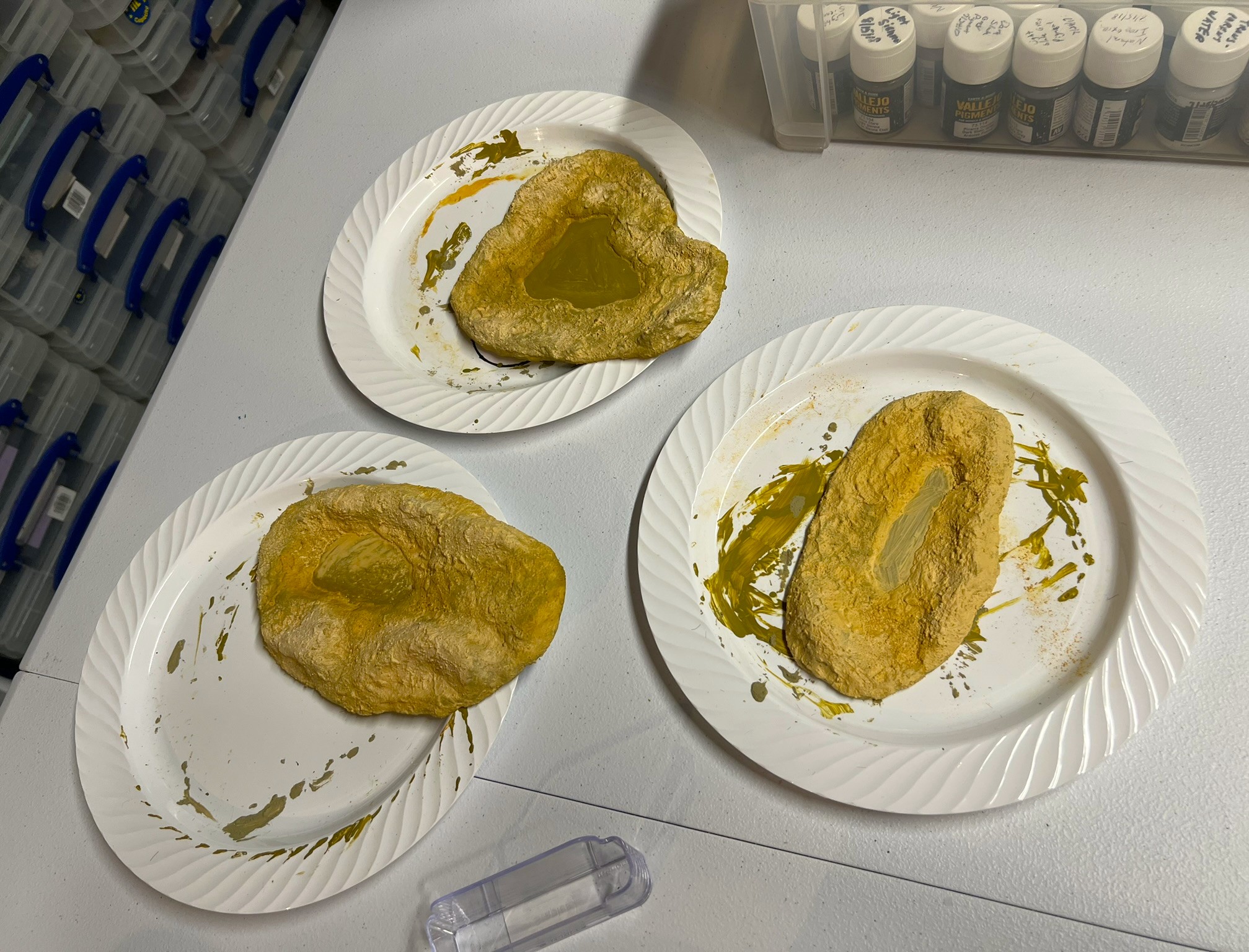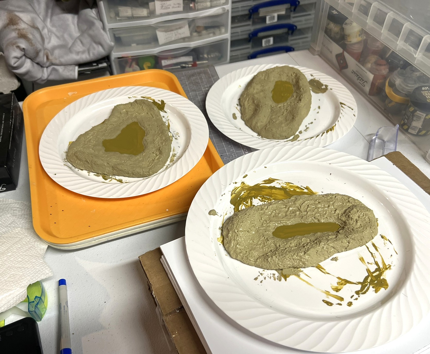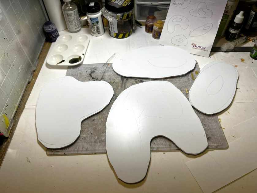 While the palm trees dried, I used my scroll saw cut up four polystyrene sheets into random shapes for the oases’ bases (that rhymes?). Apoxie Sculpt was applied on the sheets to create the shapes of the terrain. In the end, I only used three of the four sheets. I’ll save the other for later use.