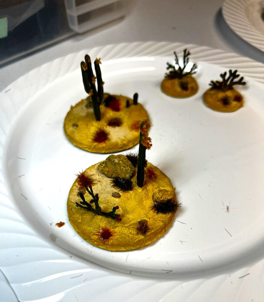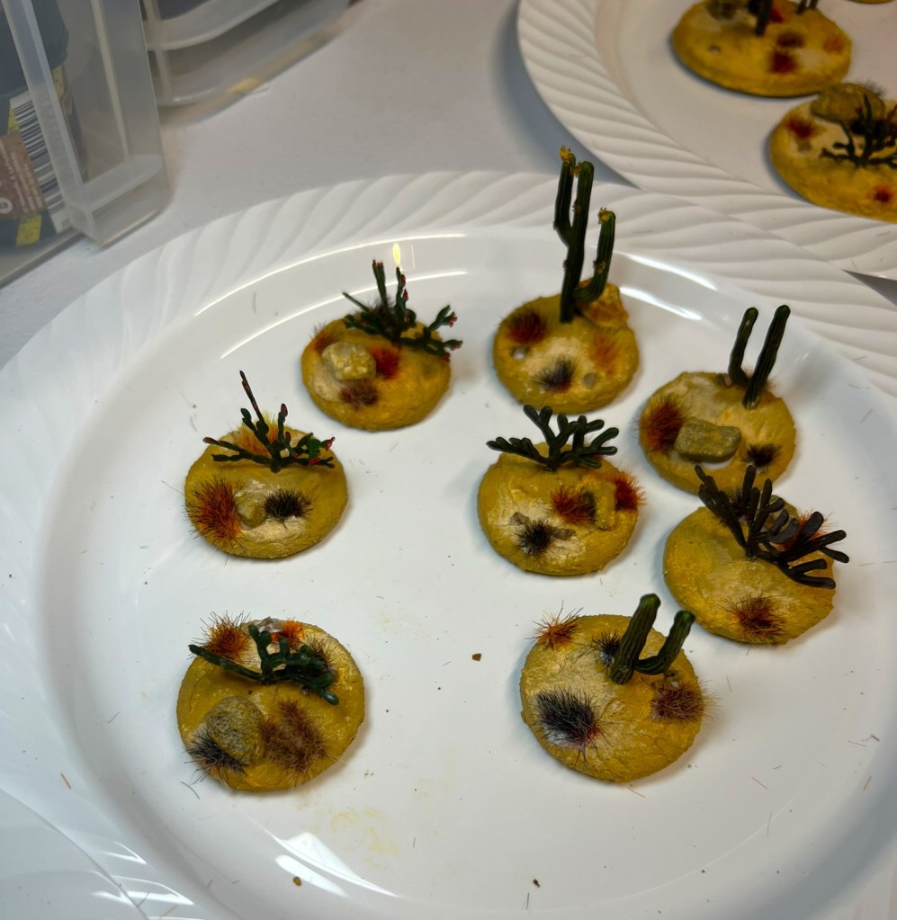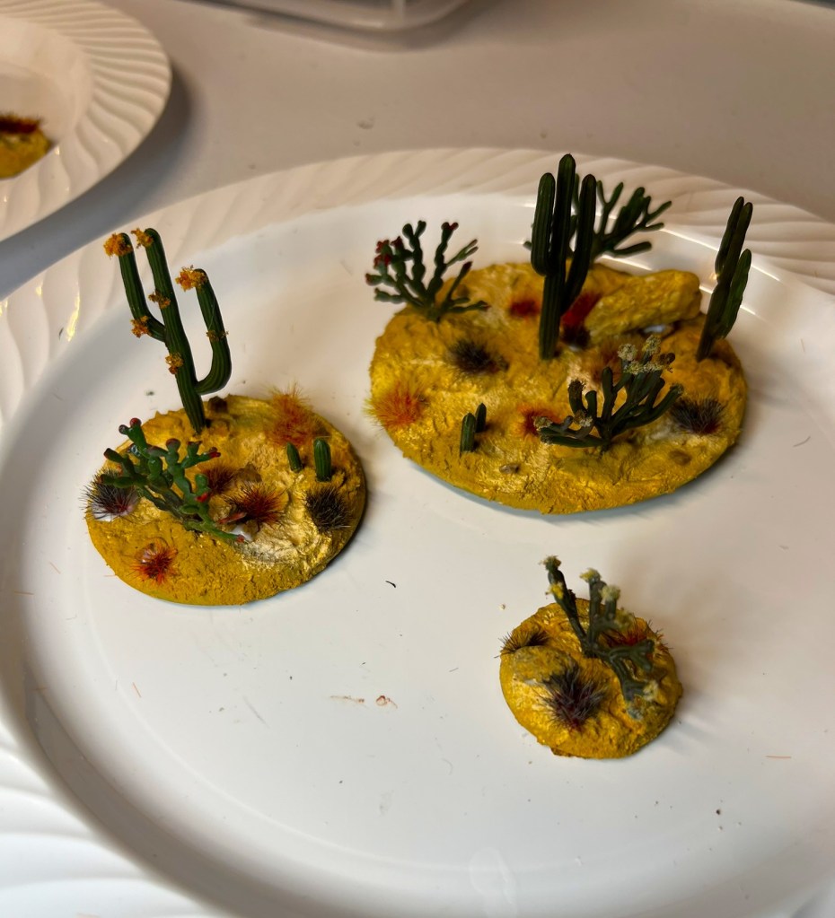 The cacti were great for building some scatter terrain. Additionally, I needed to make objective markers for one of my desert games – and oases seemed appropriate for that purpose. Lastly, my deciduous and evergreen tree collection (which is mostly second-hand from a flea market) needed an upgrade badly as they were looking like victims of Agent Orange defoliant. So, Mom’s tree gift of three Hobby Lobby trees was another scatter terrain opportunity. I’ll discuss the cacti scatter bases first, then the oases build, and lastly the trees.