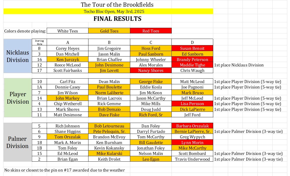 The next tournament is just a few weeks away on Saturday, June 21st, 2025. It will be the Toomey-Lovett Classic. This event will also be VERY well-attended, so sign up early at Still Harts, at Quail Hollow, or on the Tour of the Brookfields Facebook page!