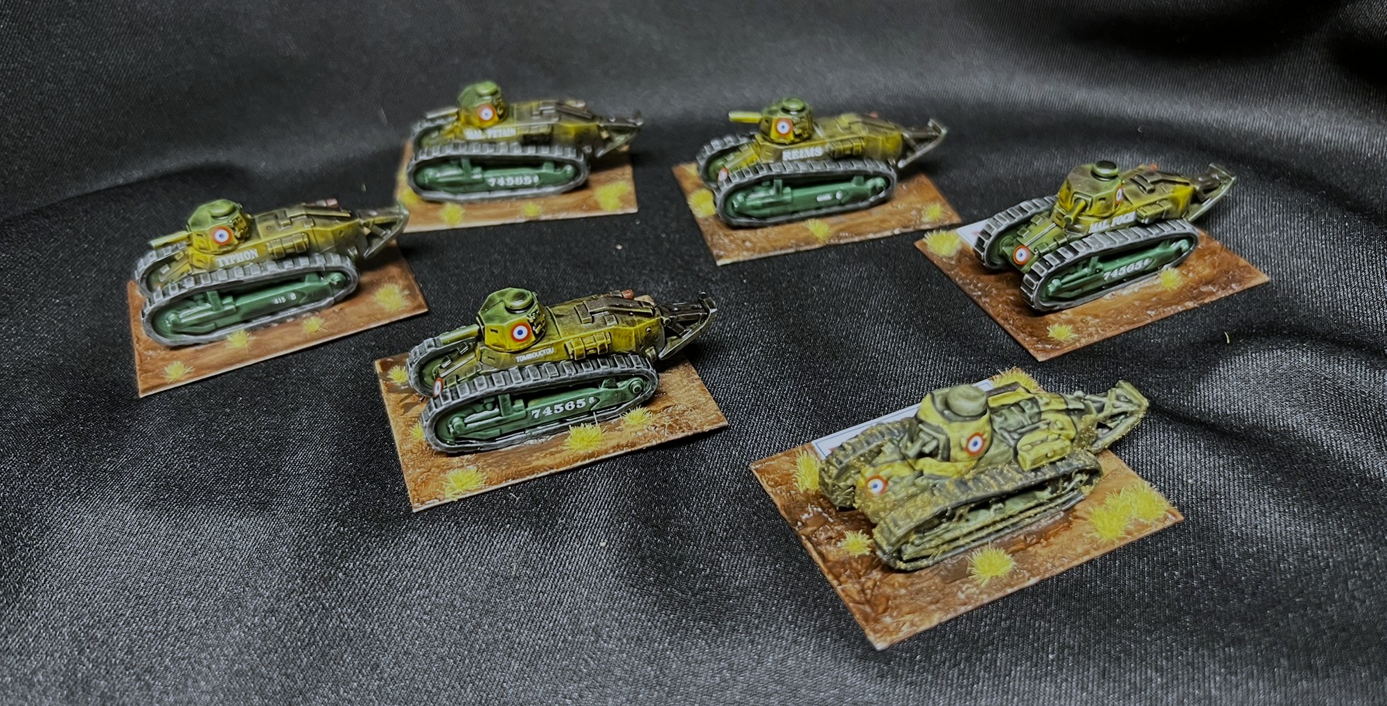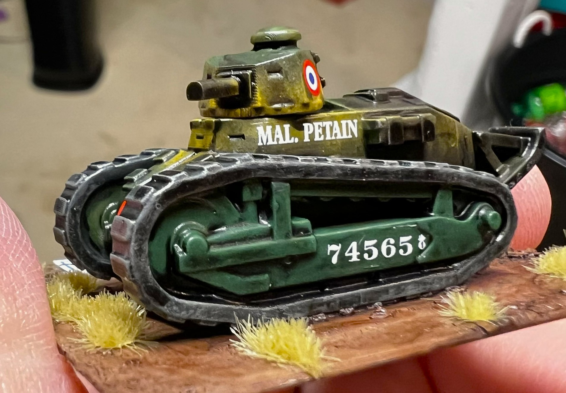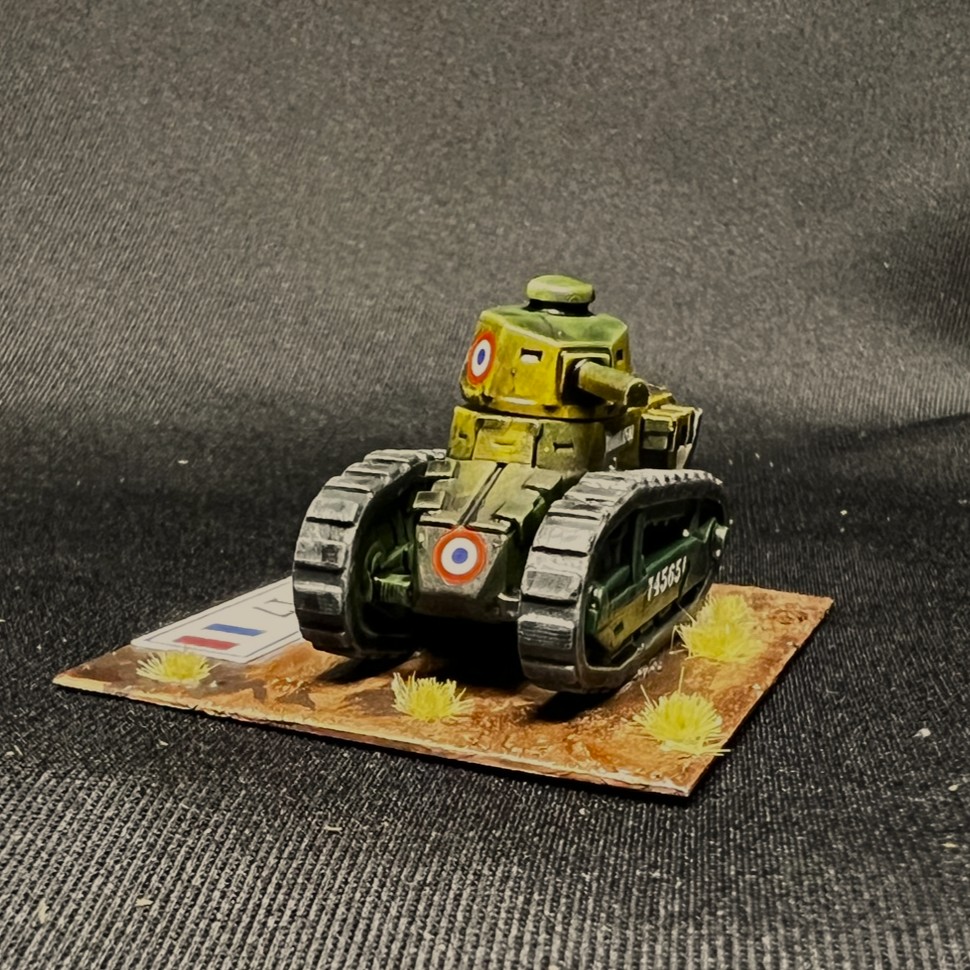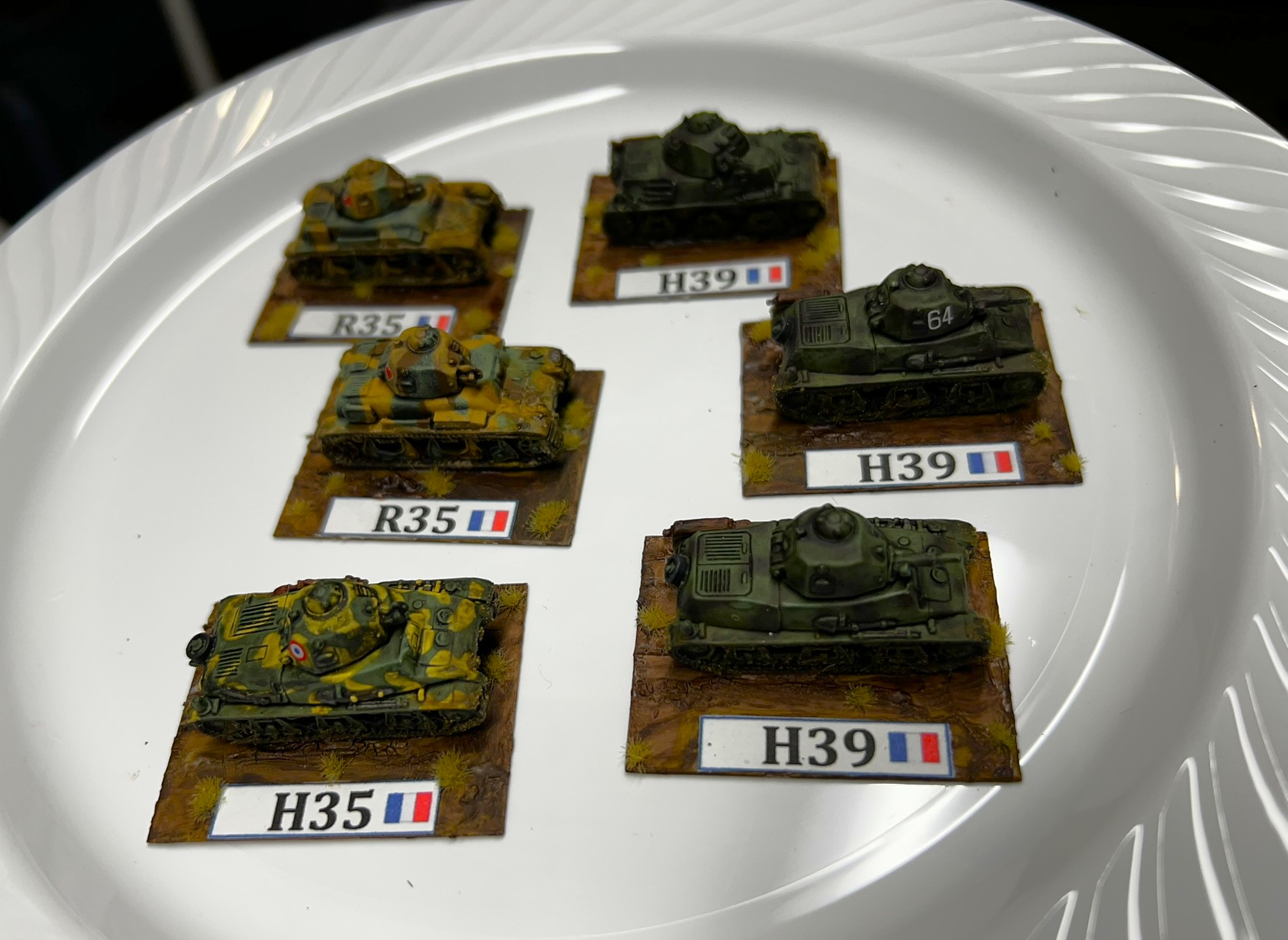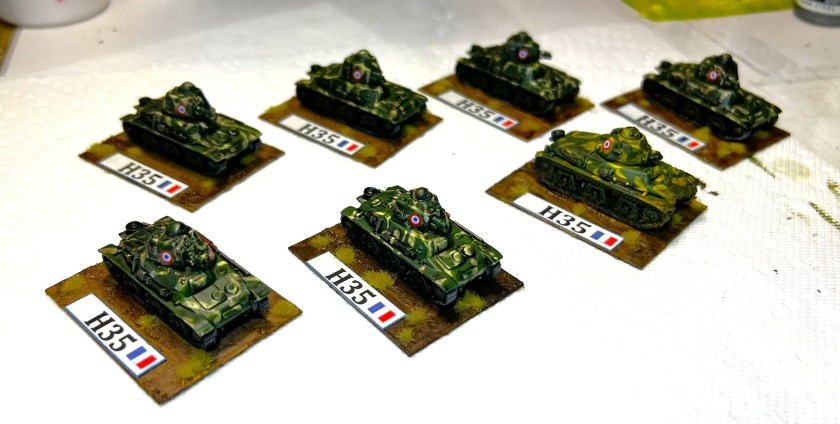 In gathering appropriate models for my What a Tanker game for HISTORICON, I started with looking for H35 and H39 metal or 3D-printed models in resin. I found a two listings for some on eBay. One was for Sarge_s Stuff – he had H35’s that could be bought individually – and I ordered 4 of them. The other site was the same one I bought the FT-17’s from earlier – jacobsminis (aka HobbyHouse&Miniatures.LLC). I ordered 5 from HH&M as that was the minimum order. The tanks from HH&M were (and still are) listed as H39’s, but when I got them I realized that they were actually H35’s. Unlike their excellent FT-17 models, some of these had printing errors, and I ended up using just 2 of these. However, I did use all 4 of the Sarge_s Stuff ones as H35’s. For H39’s and R35’s, I decided to rebase the ones that I painted a few years ago. I had 1 H35 and 3 H39’s (documented here) and 2 R35’s (documented here). I rebased all 6 of these.