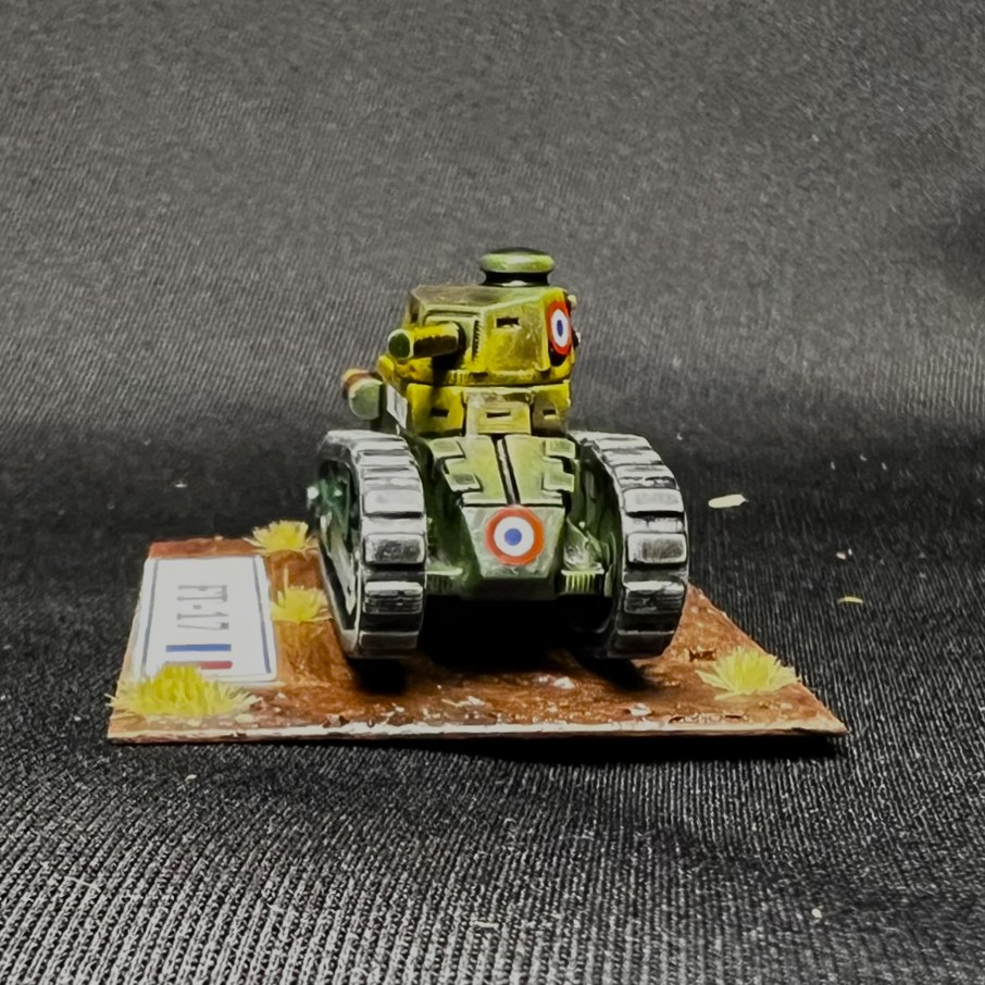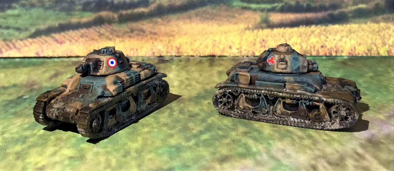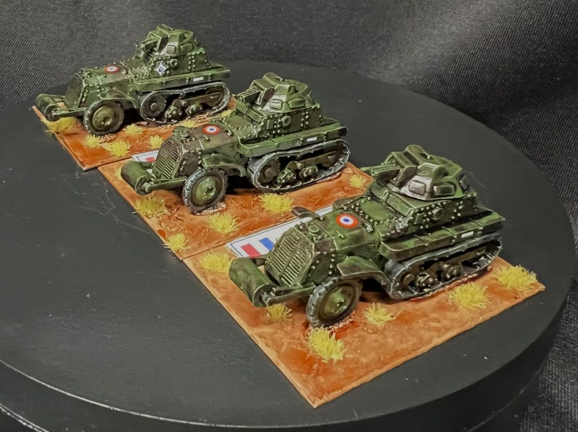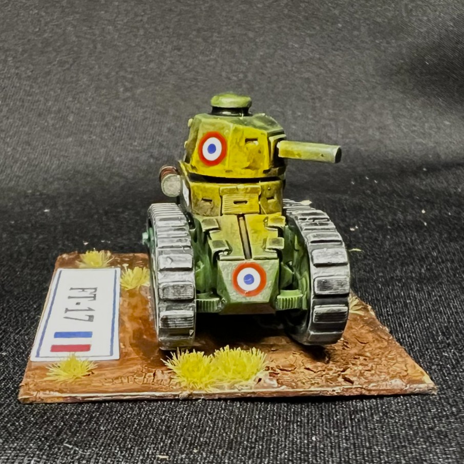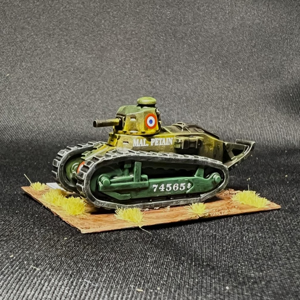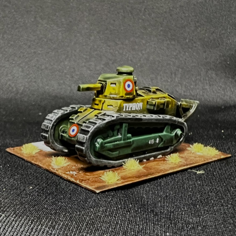 In gathering appropriate models for my What a Tanker game for HISTORICON, I started with looking for H35 and H39 metal or 3D-printed models in resin. I found a two listings for some on eBay. One was for Sarge_s Stuff – he had H35’s that could be bought individually – and I ordered 4 of them. The other site was the same one I bought the FT-17’s from earlier – jacobsminis (aka HobbyHouse&Miniatures.LLC). I ordered 5 from HH&M as that was the minimum order. The tanks from HH&M were (and still are) listed as H39’s, but when I got them I realized that they were actually H35’s. Unlike their excellent FT-17 models, some of these had printing errors, and I ended up using just 2 of these. However, I did use all 4 of the Sarge_s Stuff ones as H35’s. For H39’s and R35’s, I decided to rebase the ones that I painted a few years ago. I had 1 H35 and 3 H39’s (documented here) and 2 R35’s (documented here). I rebased all 6 of these.