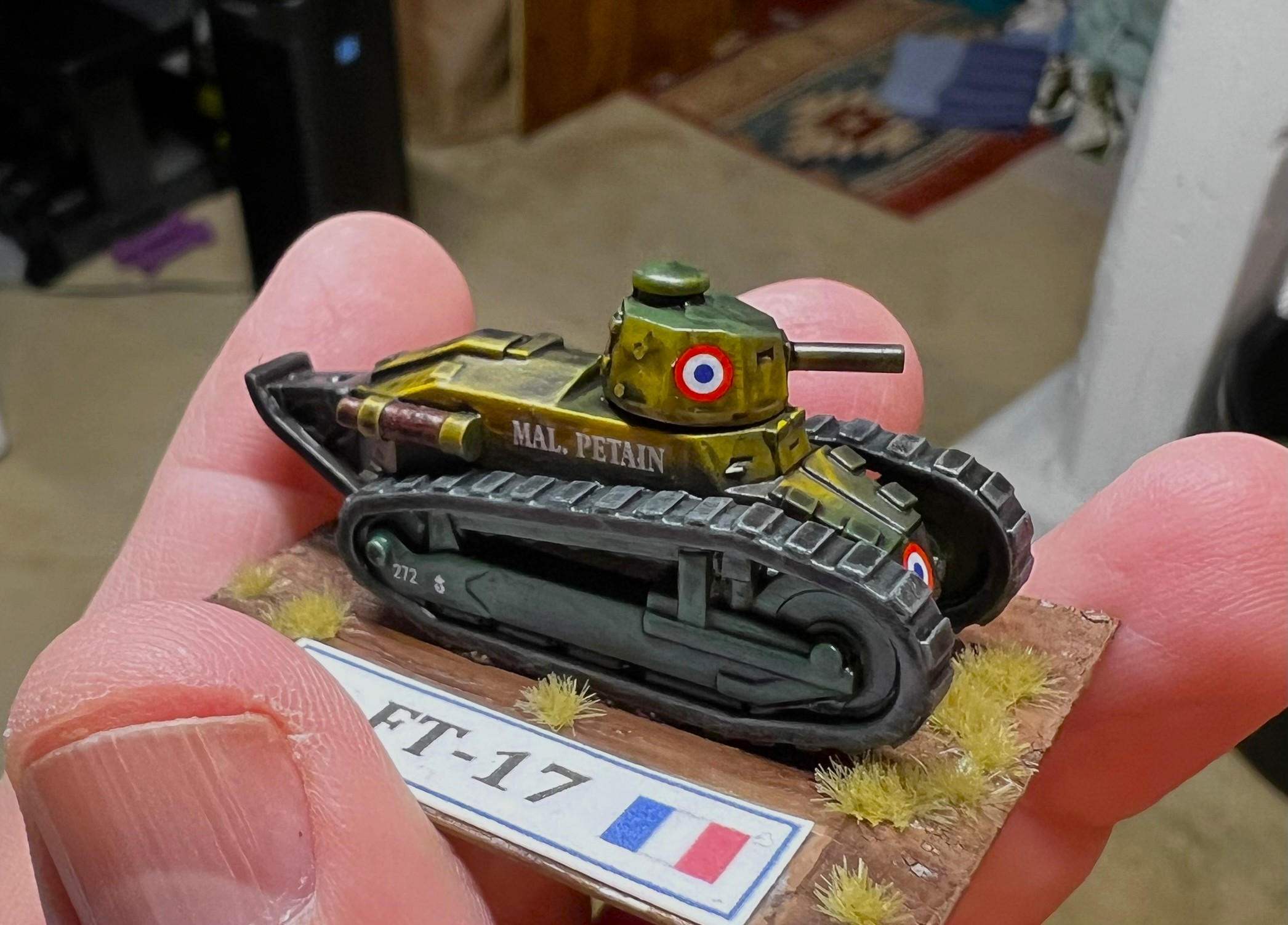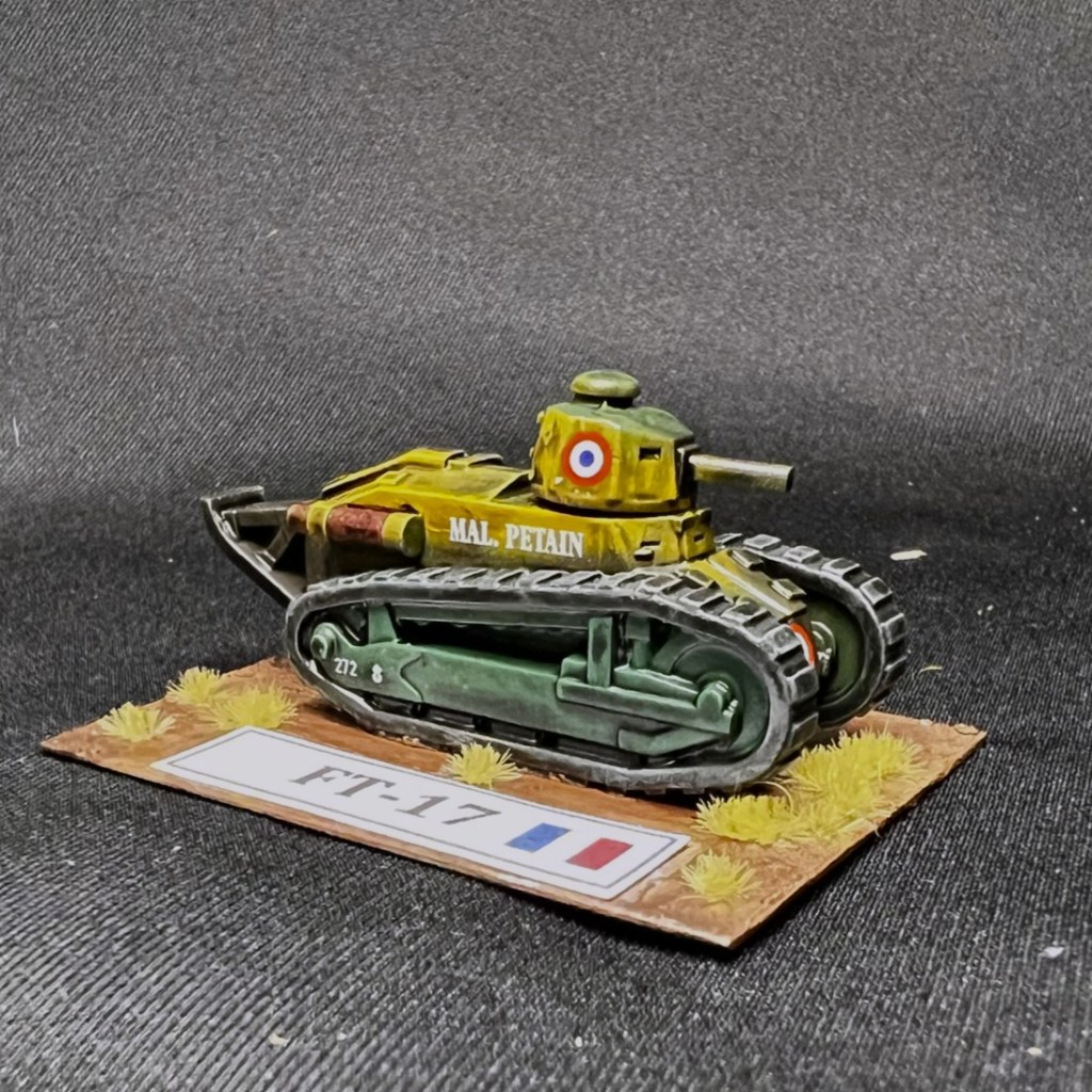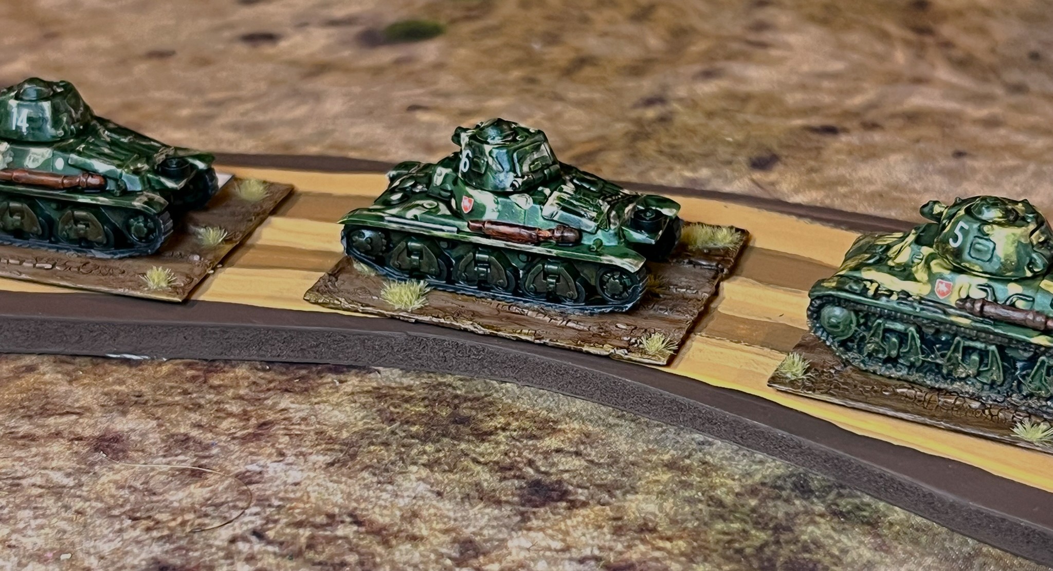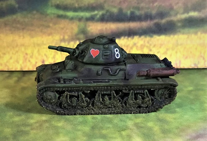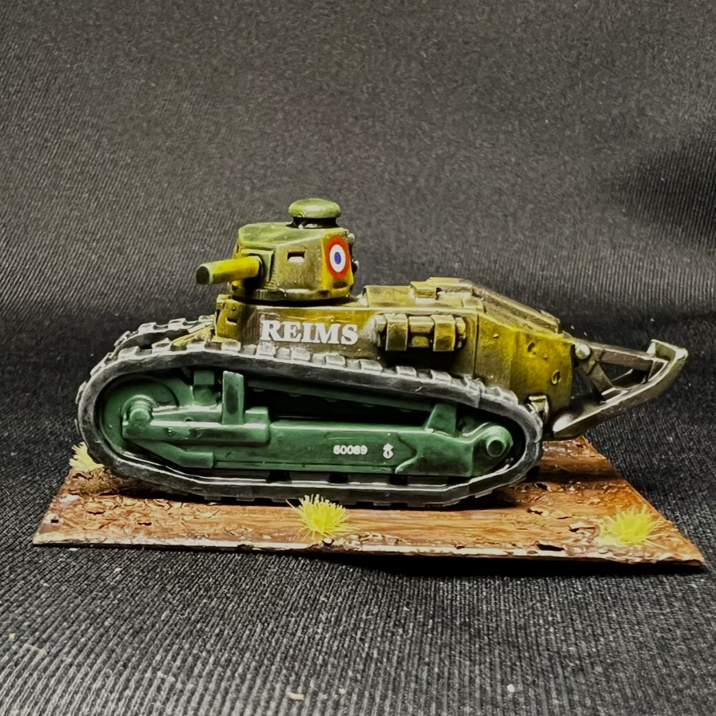 In gathering appropriate models for my What a Tanker game for HISTORICON, I started with looking for H35 and H39 metal or 3D-printed models in resin. I found a two listings for some on eBay. One was for Sarge_s Stuff – he had H35’s that could be bought individually – and I ordered 4 of them. The other site was the same one I bought the FT-17’s from earlier – jacobsminis (aka HobbyHouse&Miniatures.LLC). I ordered 5 from HH&M as that was the minimum order. The tanks from HH&M were (and still are) listed as H39’s, but when I got them I realized that they were actually H35’s. Unlike their excellent FT-17 models, some of these had printing errors, and I ended up using just 2 of these. However, I did use all 4 of the Sarge_s Stuff ones as H35’s. For H39’s and R35’s, I decided to rebase the ones that I painted a few years ago. I had 1 H35 and 3 H39’s (documented here) and 2 R35’s (documented here). I rebased all 6 of these.