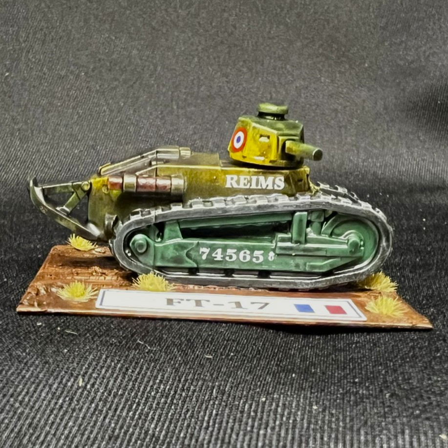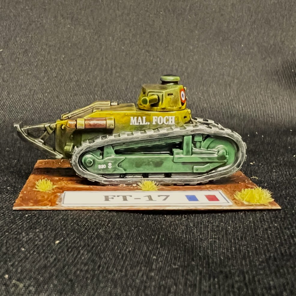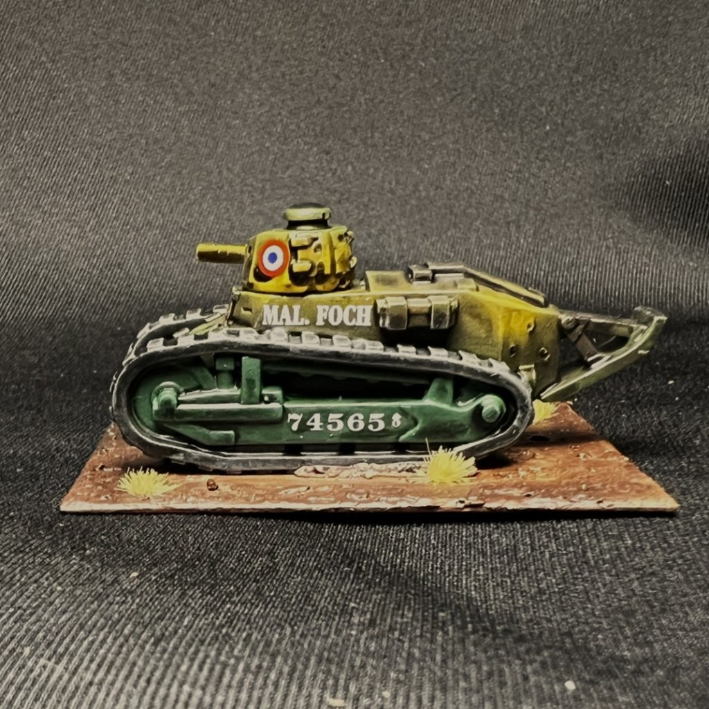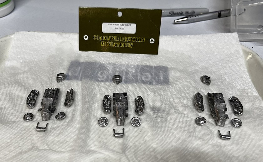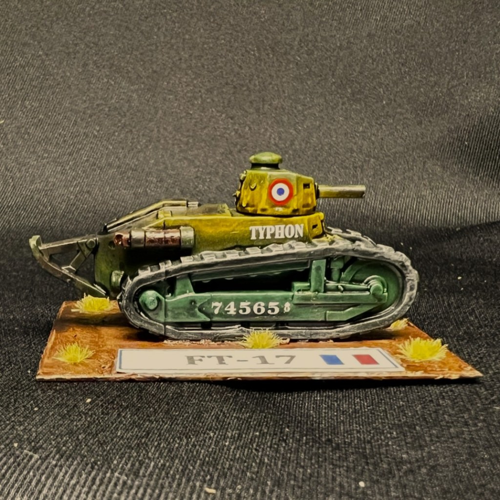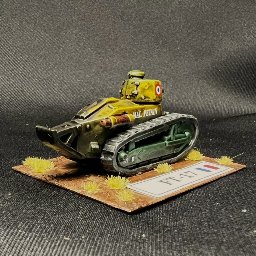 In gathering appropriate models for my What a Tanker game for HISTORICON, I started with looking for H35 and H39 metal or 3D-printed models in resin. I found a two listings for some on eBay. One was for Sarge_s Stuff – he had H35’s that could be bought individually – and I ordered 4 of them. The other site was the same one I bought the FT-17’s from earlier – jacobsminis (aka HobbyHouse&Miniatures.LLC). I ordered 5 from HH&M as that was the minimum order. The tanks from HH&M were (and still are) listed as H39’s, but when I got them I realized that they were actually H35’s. Unlike their excellent FT-17 models, some of these had printing errors, and I ended up using just 2 of these. However, I did use all 4 of the Sarge_s Stuff ones as H35’s. For H39’s and R35’s, I decided to rebase the ones that I painted a few years ago. I had 1 H35 and 3 H39’s (documented here) and 2 R35’s (documented here). I rebased all 6 of these.