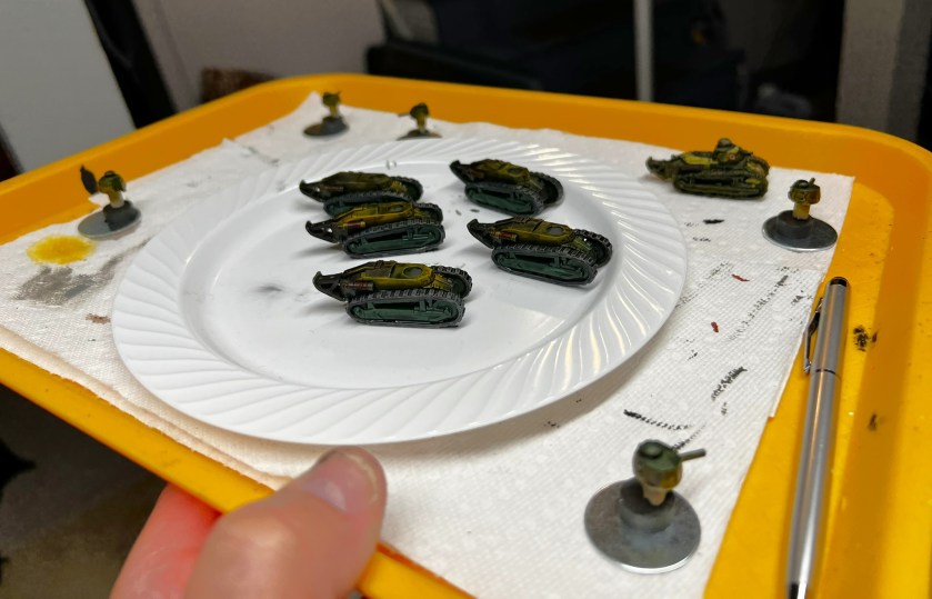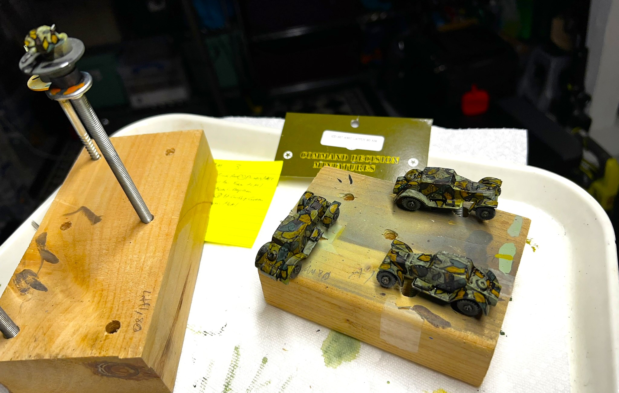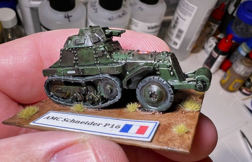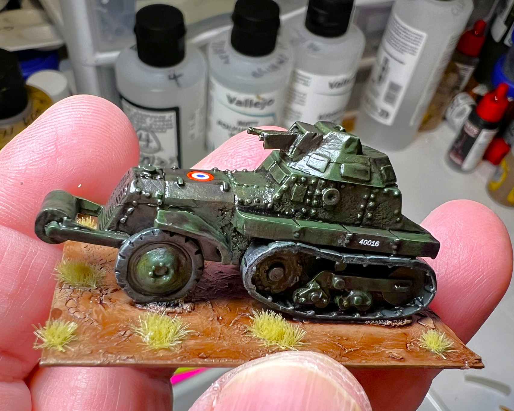 This left me with 6 H35’s to paint to round out the tanks for Vichy (more armored cars would be coming!). As I was also working on many other vehicles at the time, plus running for reelection (I won), plus preparing for and attending HUZZAH, AND prepping for HISTORICON…plus golf…I was BUSY in April, May and even June and July. I am sure that you get the picture, and ironically I have few WIP pictures! But I’ll share what I have.