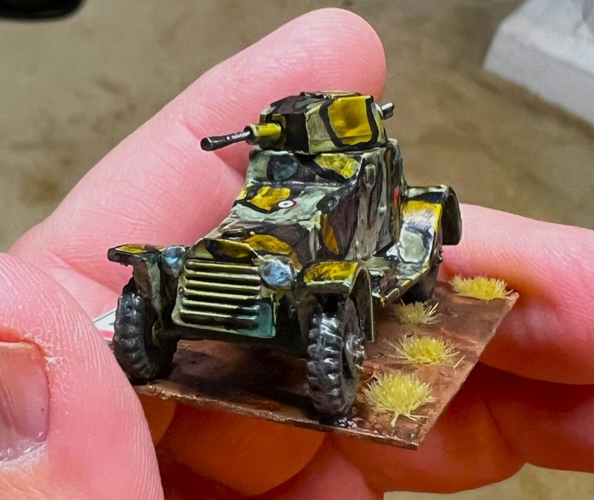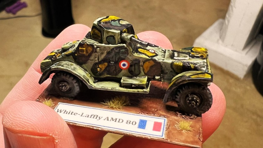 I am indeed – as promised – catching up on the posts I have backlogged for my What a Tanker Operation Torch game project- and yes there are more AFV’s to come. I do appreciate you, my readers. Of the eventually-painted 31 Vichy vehicles I had for the game, this brings me up to 24 Vichy combat vehicles that I have covered to date in this blog. I have 8 remaining Vichy armored cars to write about before I get to the USA. Those 8 will be the topic of my next post. Please, if you want, I’d love to hear any feedback – feel free to let me know your thoughts in the comments section.