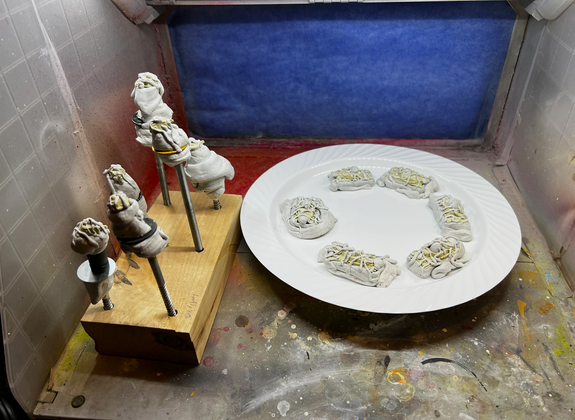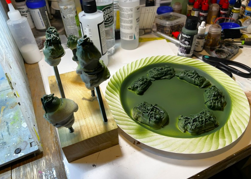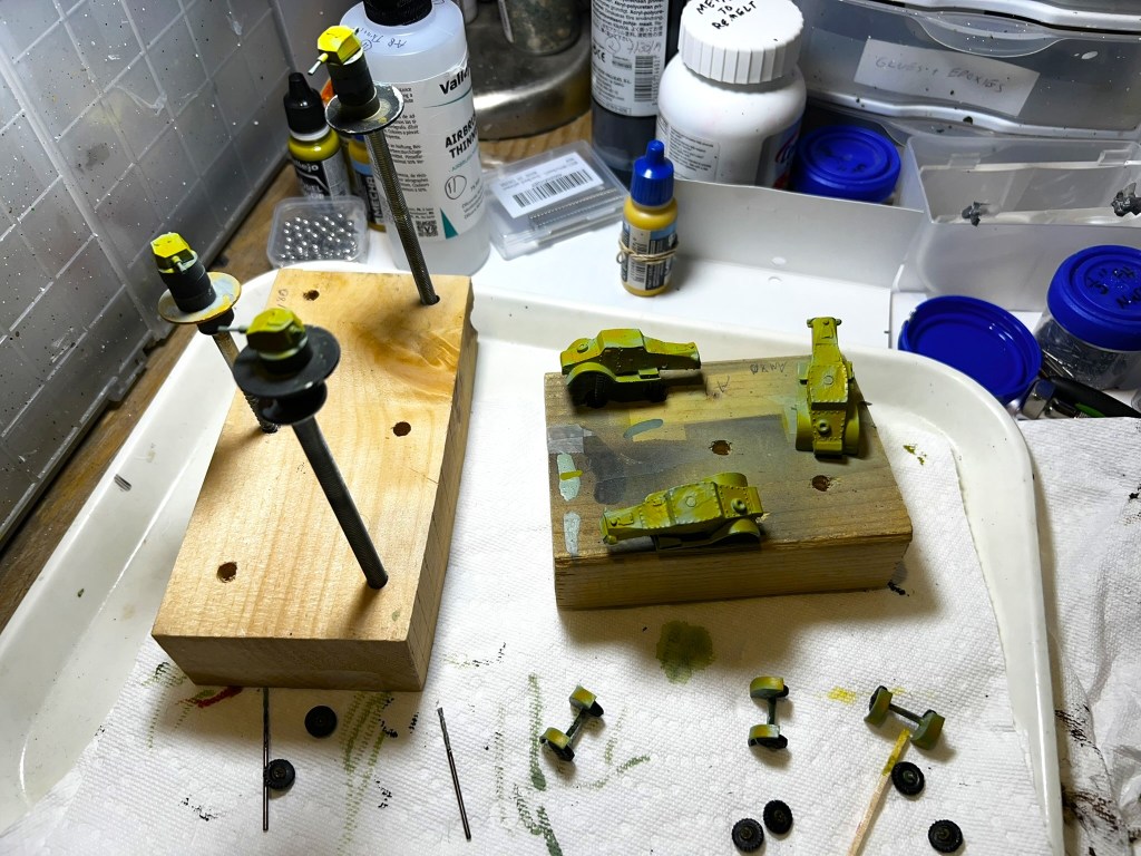 I used poster-tack again for masking/making camouflage patterns over the initial color. I did experiment with using Silly Putty as masking as I had seen someone do that – but it did not work for me. So I went back to what I knew would work – poster tack and touching up afterwards..