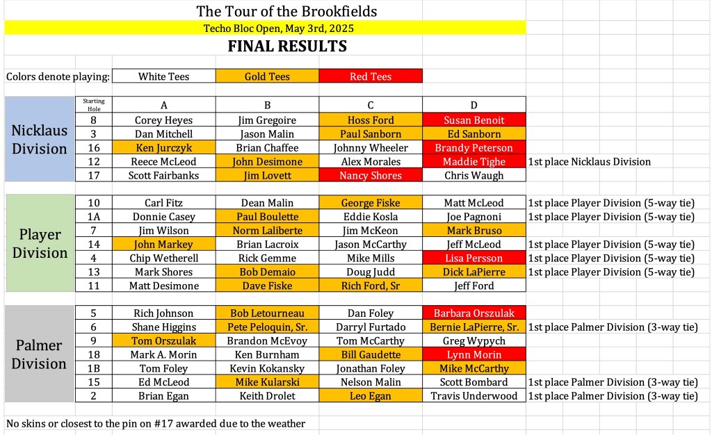 What an amazing final we had for the 2025 Tour of the Brookfields! It was held on Saturday, September 27th at Quail Hollow Golf and Country Club in Oakham, MA. We had 107 golfers. on 27 teams in 3 different flights. Let’s get into the results!