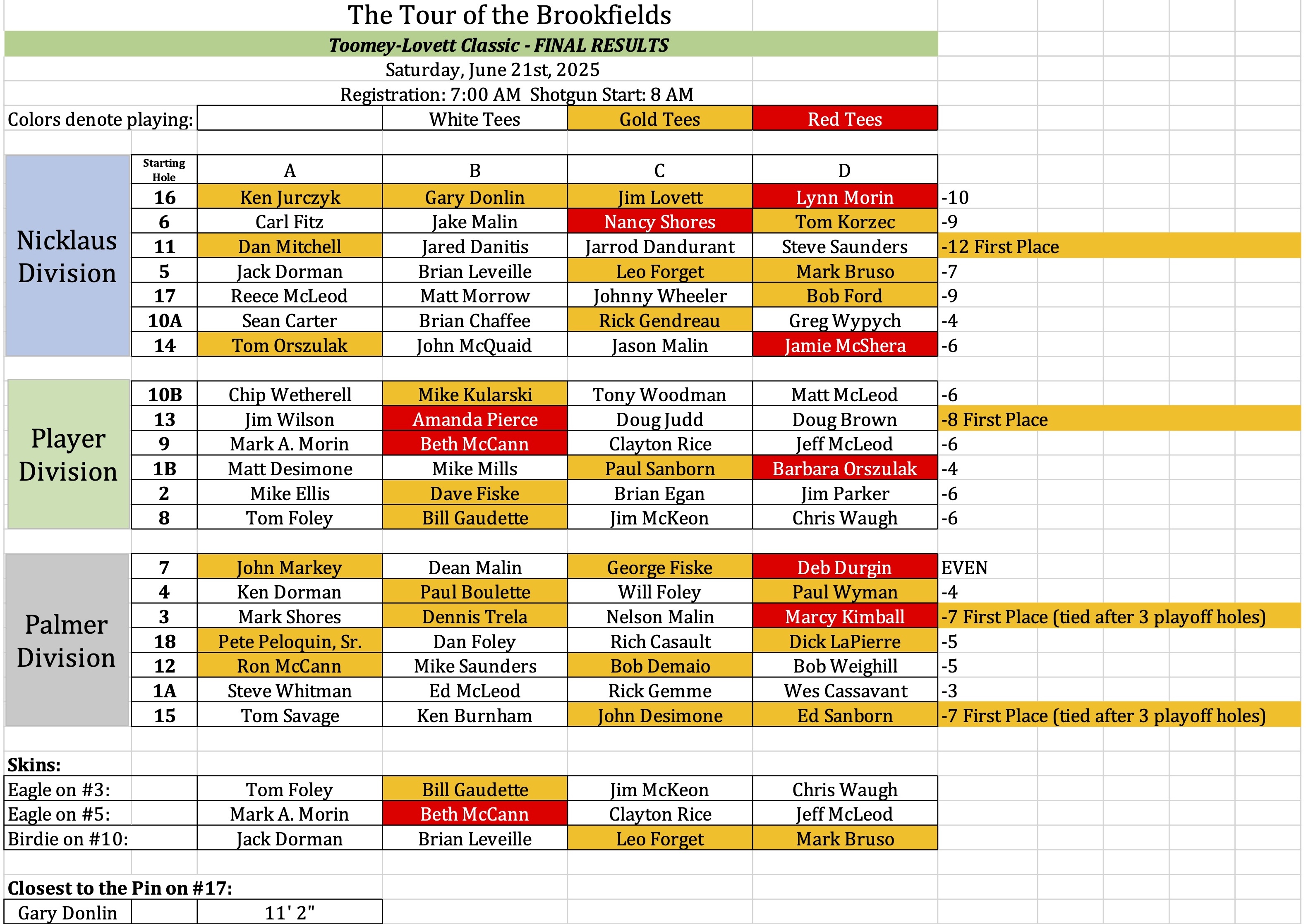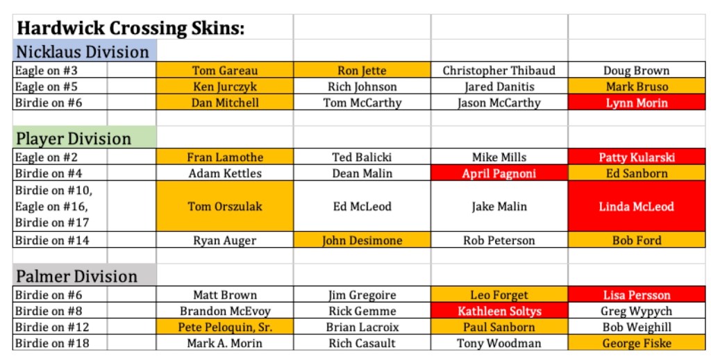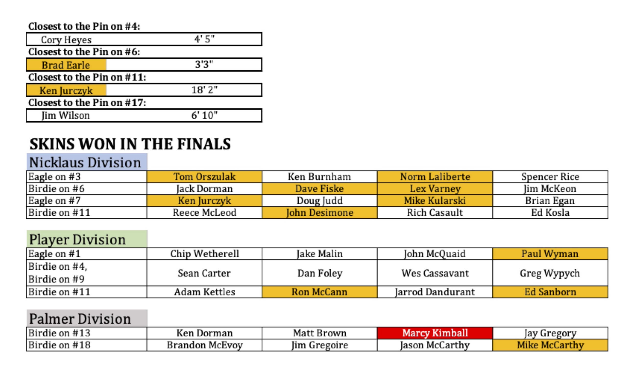 Below you can see the results of all three flights. You can also see the closest to the pin results. Additionally, the Skins won by flight are displayed. Click on the images to get a better view.