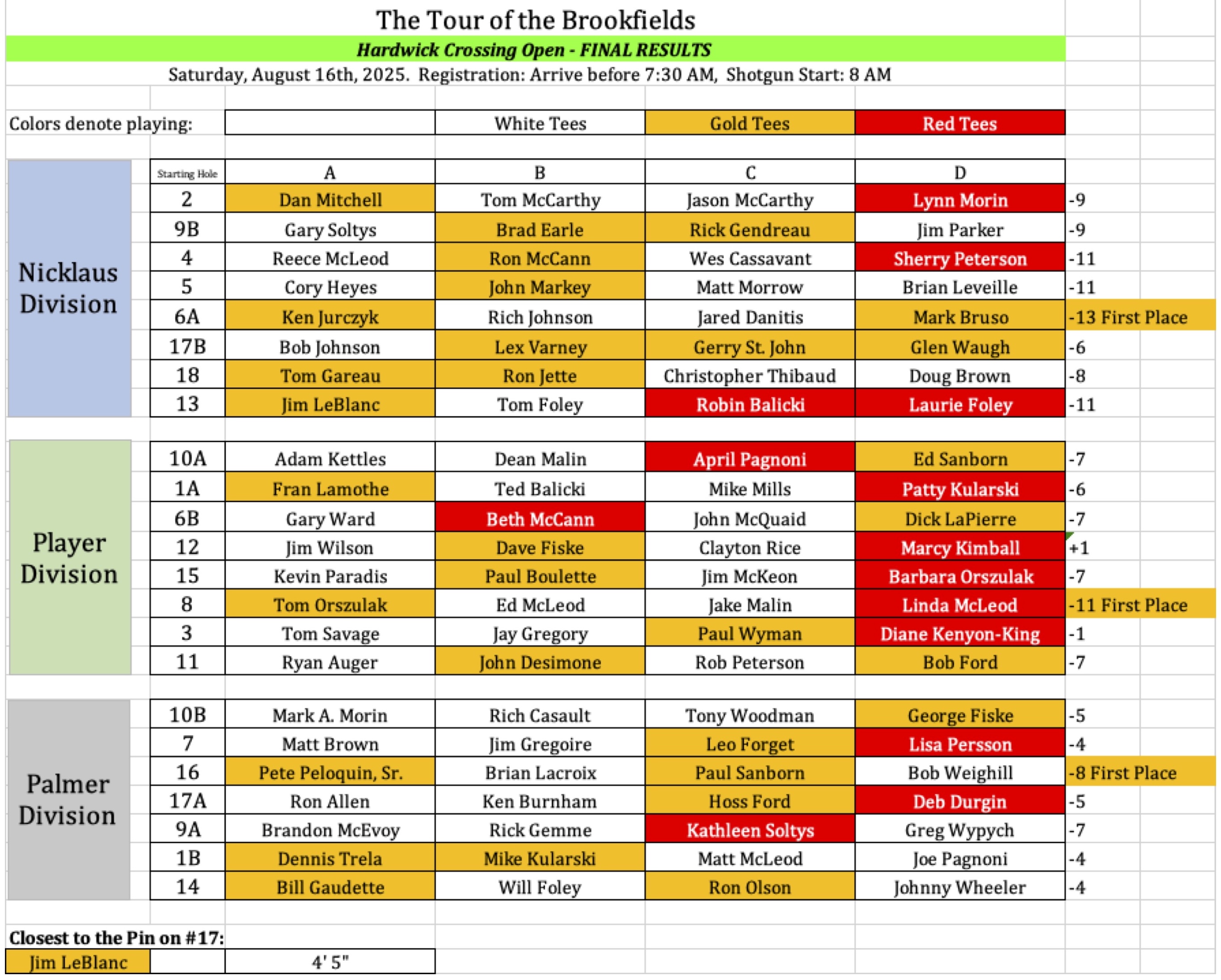 Extra special thanks to Carl Fitz, Jim LeBlanc, Tara, Ed, Art, Kenny, Ron and all the staff at Quail Hollow. They work so hard to make the Tour of the Brookfields possible!!!!