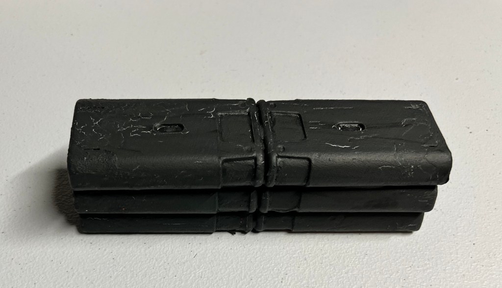 To make sure what I wanted to do would work (and to learn from any errors), I went with a prototype. I used an Exacto blade to remove the outer label. Then, I sanded the exterior to make it rough. To attach multiple units together, green stuff was the solution. After that hardened, I coated the outside of the attached trainers with PVA – followed by a dusting of chinchilla dust on the glue. When that combination had hardened, I primed the combinations with black primer.