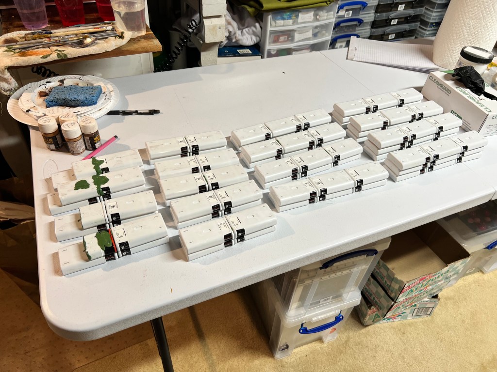I’ve been retired now since 2019. I got laid off of my last job when the company I was working for pulled the product line off the market. Never found a replacement gig. Back to the product I was selling – it was a pharmaceutical autoinjector device. We had dozens of electronic trainer devices we handed out to potential customers. These trainers acted like the real thing except without any needles or drug inside. After the layoff happened, I had a bunch of them, and was told by my former employer to just throw them away. They had a unique shape, like a cross between a card deck and a tapered brick. The outer layer was plastic, with a label glued on to it. I was running retro sci-fi games, and thought these would be good for making walls. I saved them, and they waited to fulfill their destiny until December 2025!