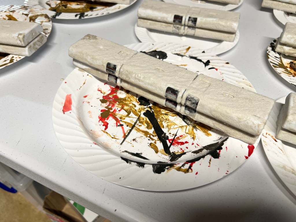 From this point, I used corrosion texture paint(let that harden), then used a number of rusting paints and pigments. I really liked the results and moved on to making two large batches of different combinations.