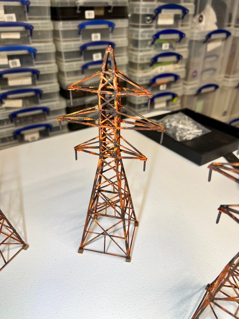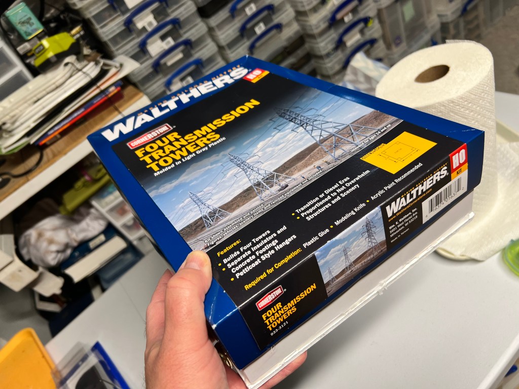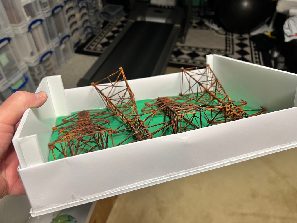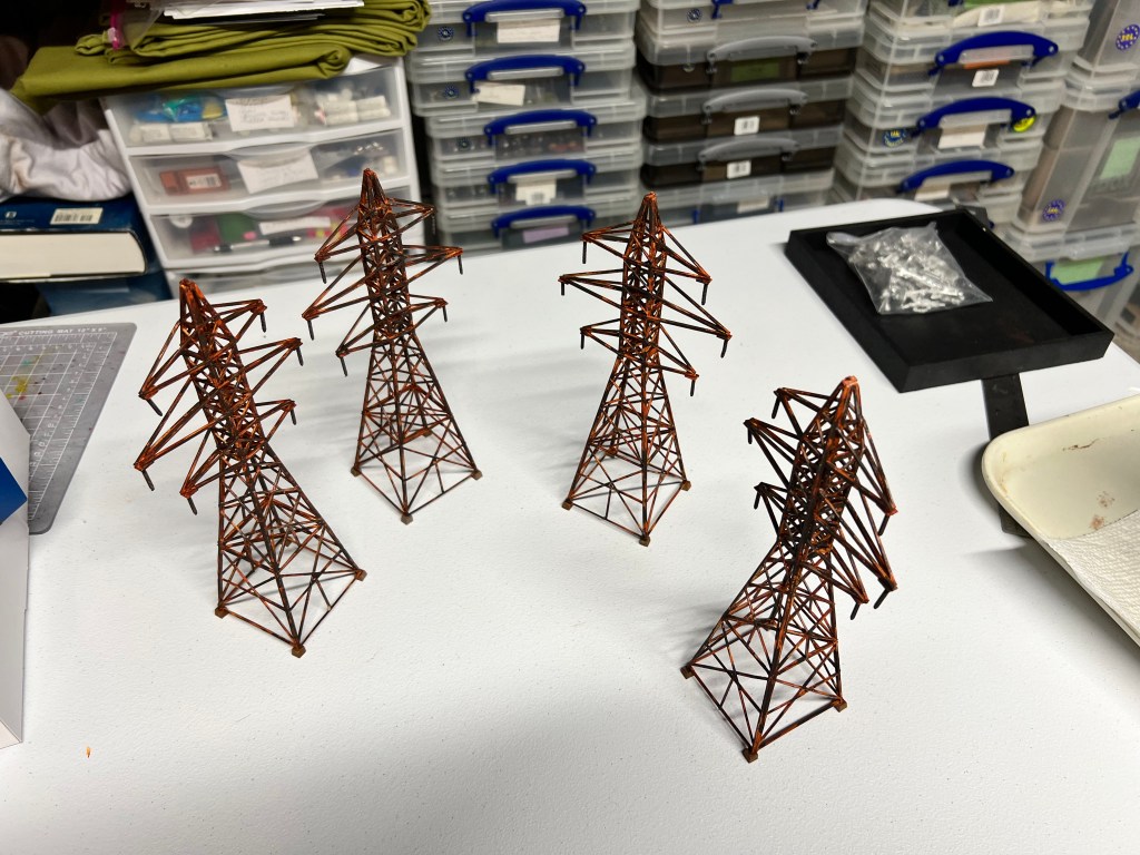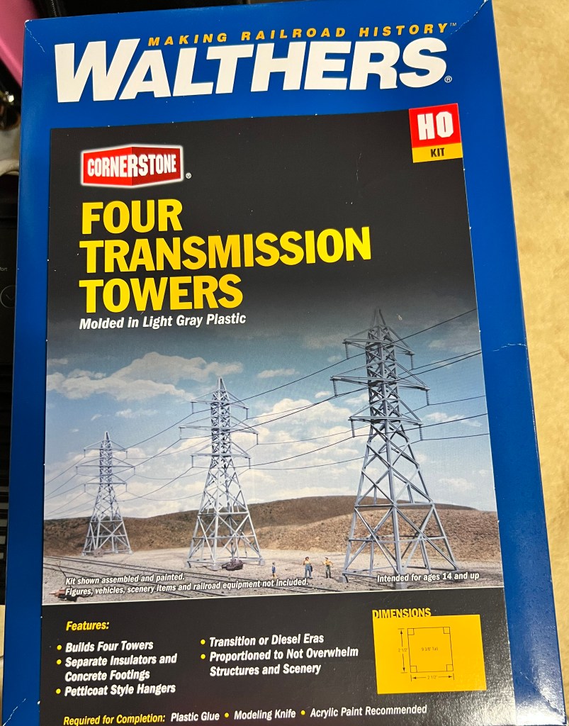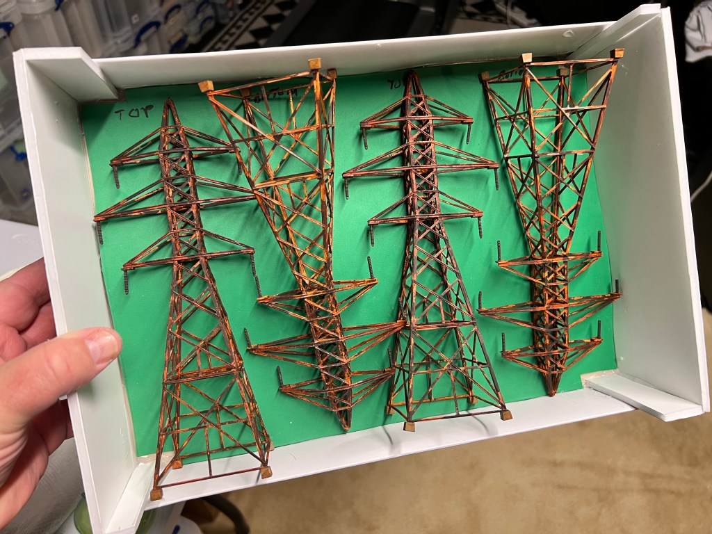 I thought transmission towers – rusty ones – would be great in that role. I found a railroad terrain kit on eBay. It was HO scale. It would go well with the other pieces of rusty fun. These were “Walther’s Cornerstone Four Transmission Towers”.
