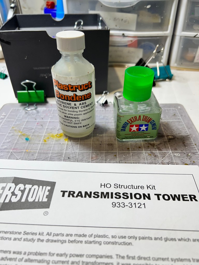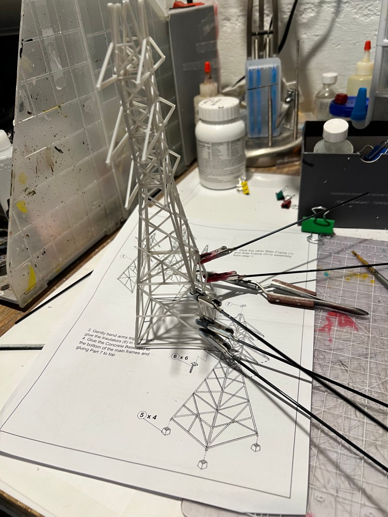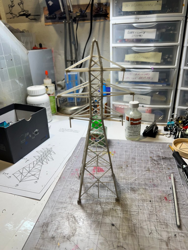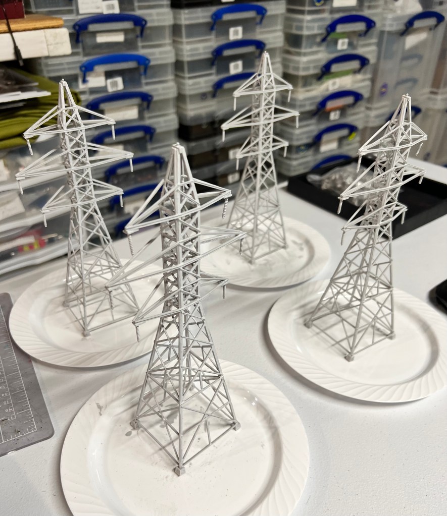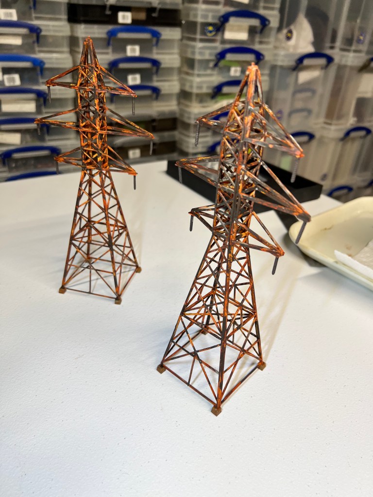 I thought transmission towers – rusty ones – would be great in that role. I found a railroad terrain kit on eBay. It was HO scale. It would go well with the other pieces of rusty fun. These were “Walther’s Cornerstone Four Transmission Towers”.
