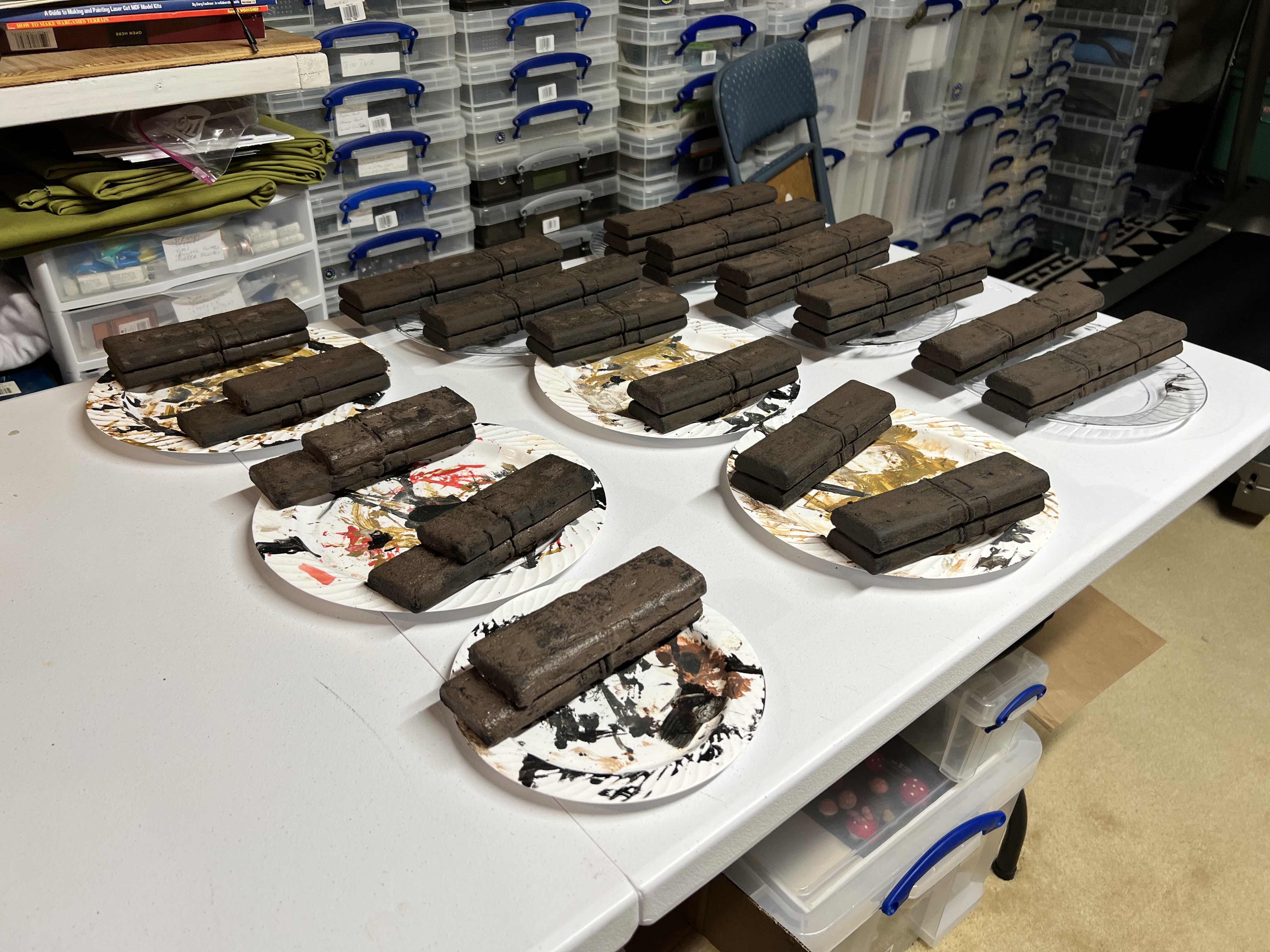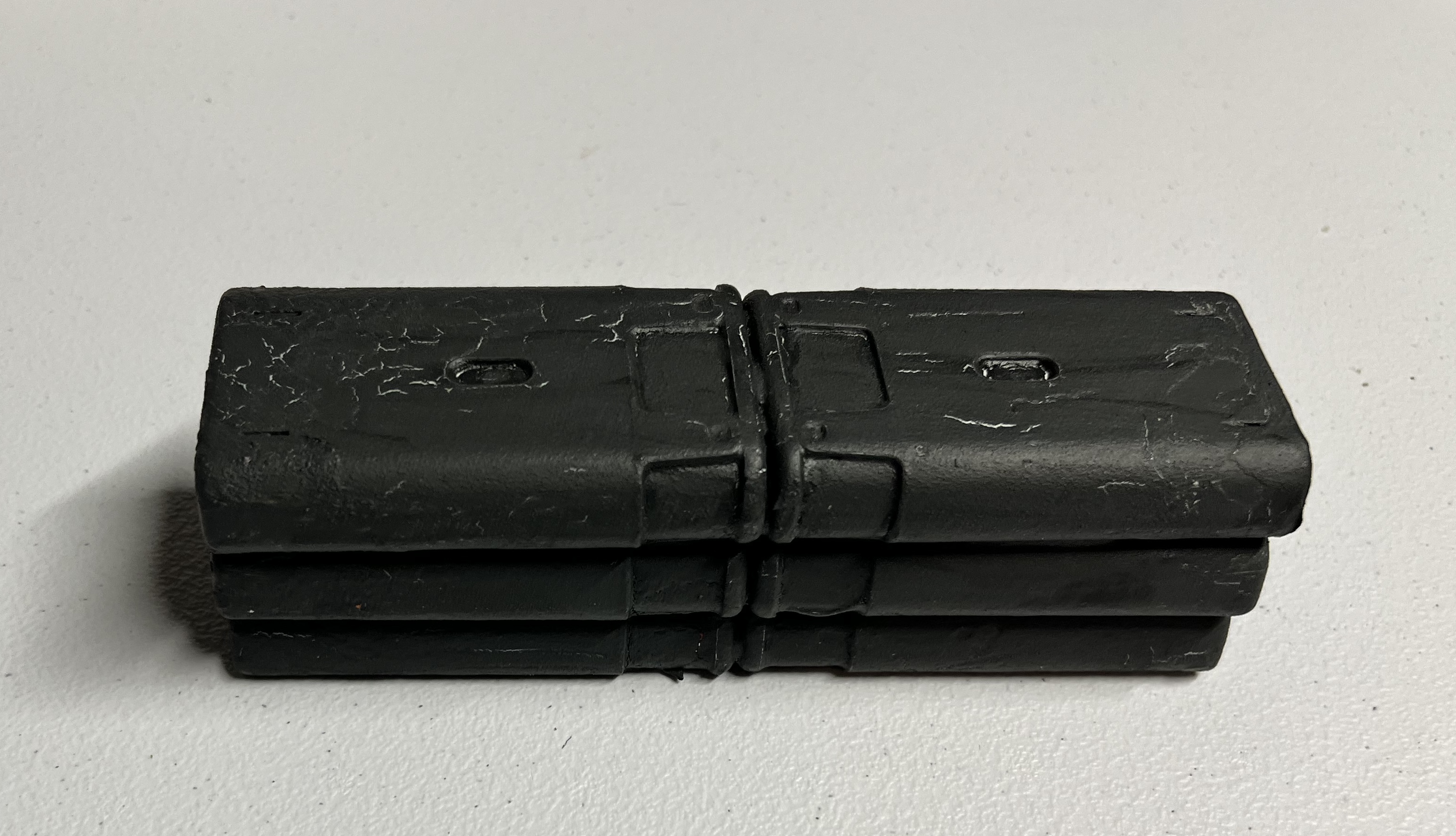 To make sure what I wanted to do would work (and to learn from any errors), I went with a prototype. I used an Exacto blade to remove the outer label. Then, I sanded the exterior to make it rough. To attach multiple units together, green stuff was the solution. After that hardened, I coated the outside of the attached trainers with PVA – followed by a dusting of chinchilla dust on the glue. When that combination had hardened, I primed the combinations with black primer.