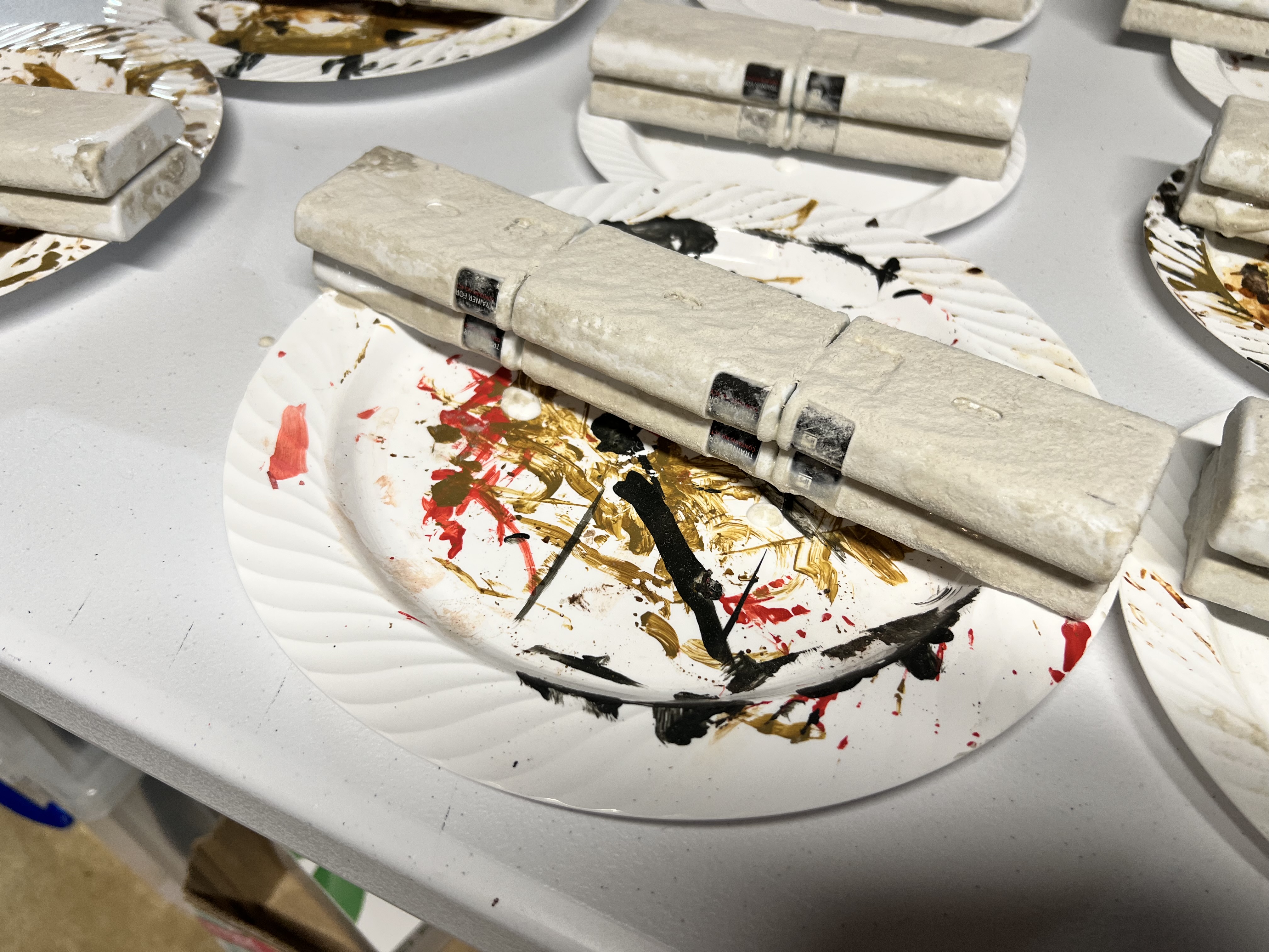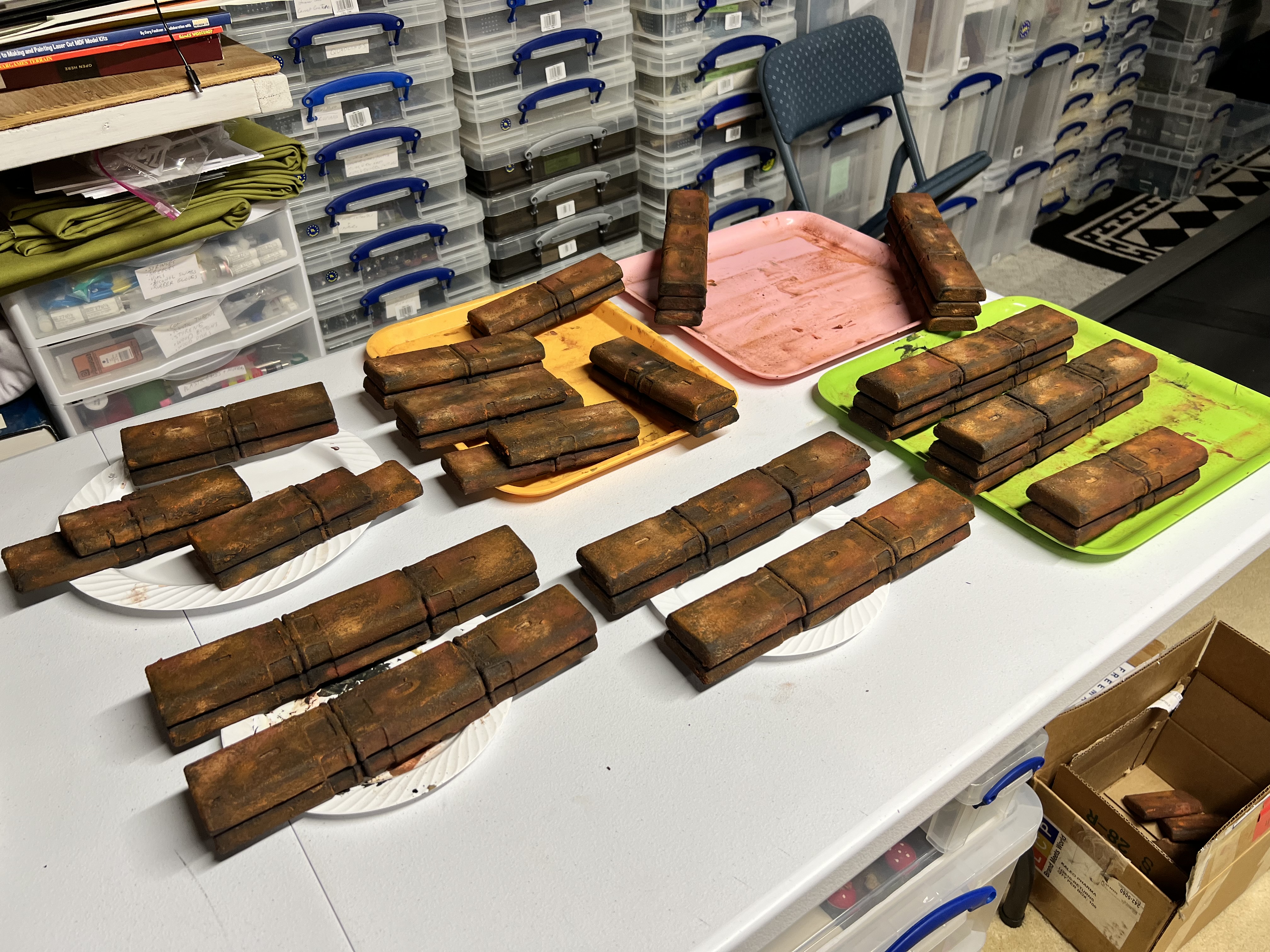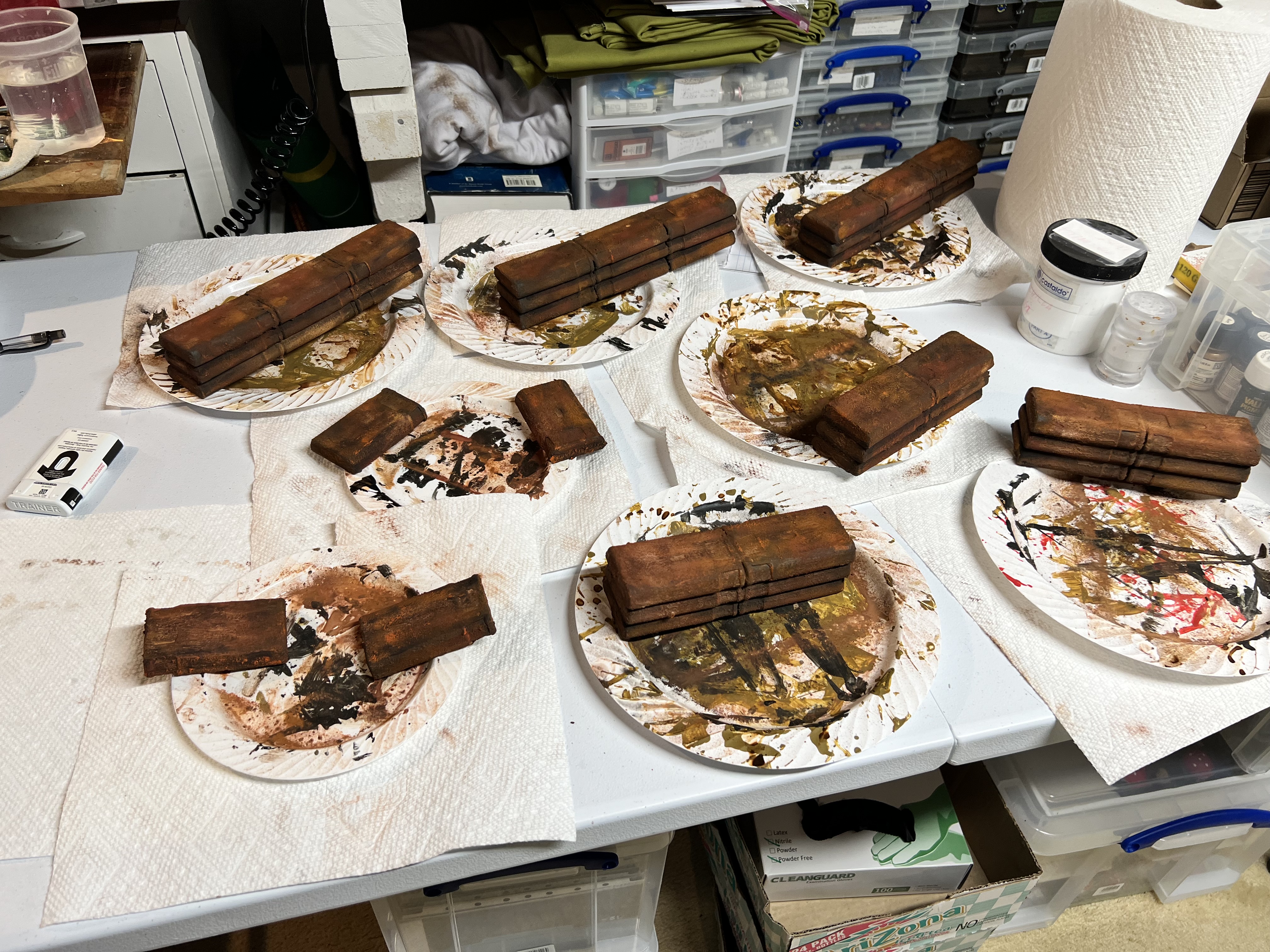 From this point, I used corrosion texture paint(let that harden), then used a number of rusting paints and pigments. I really liked the results and moved on to making two large batches of different combinations.