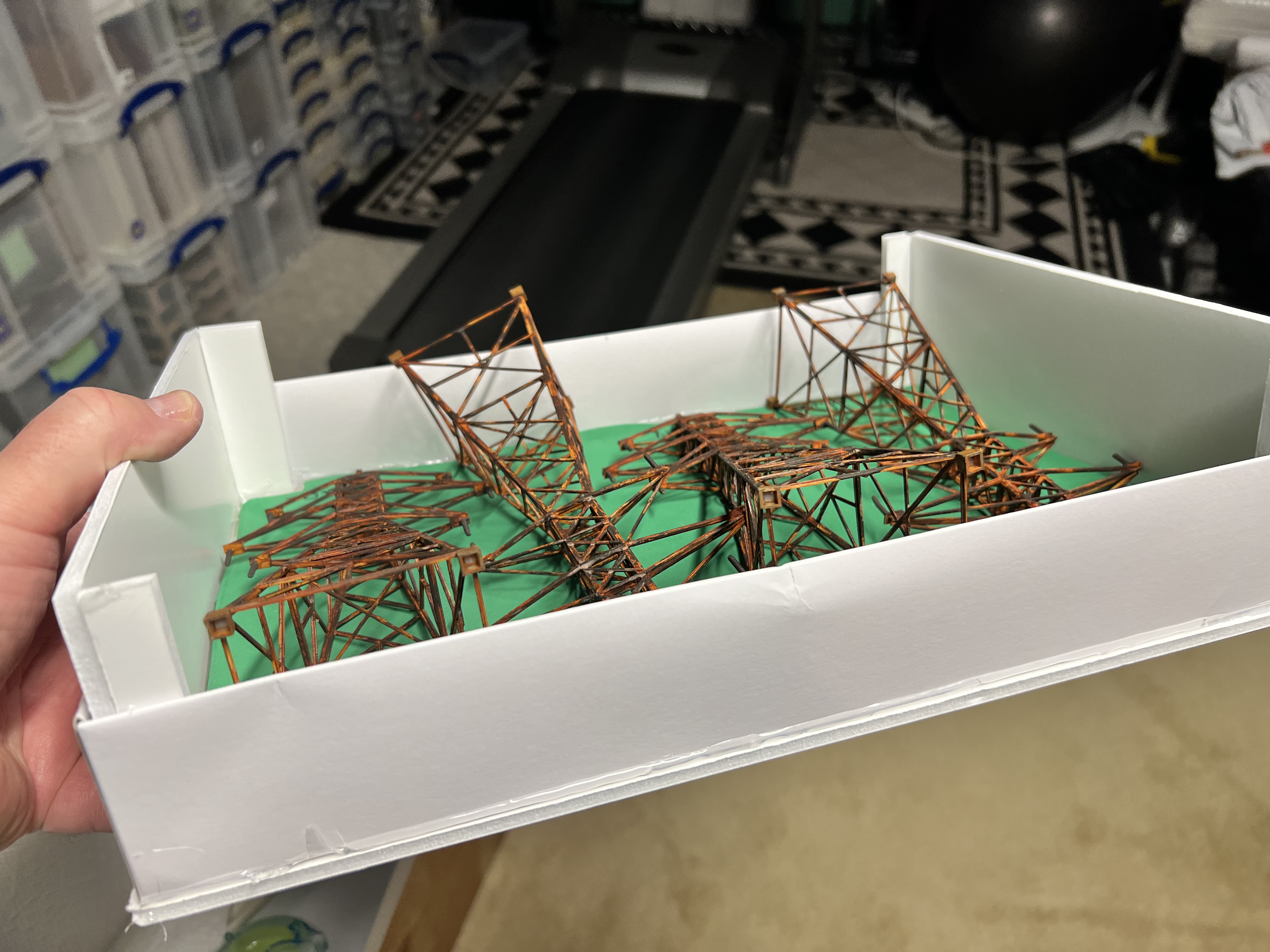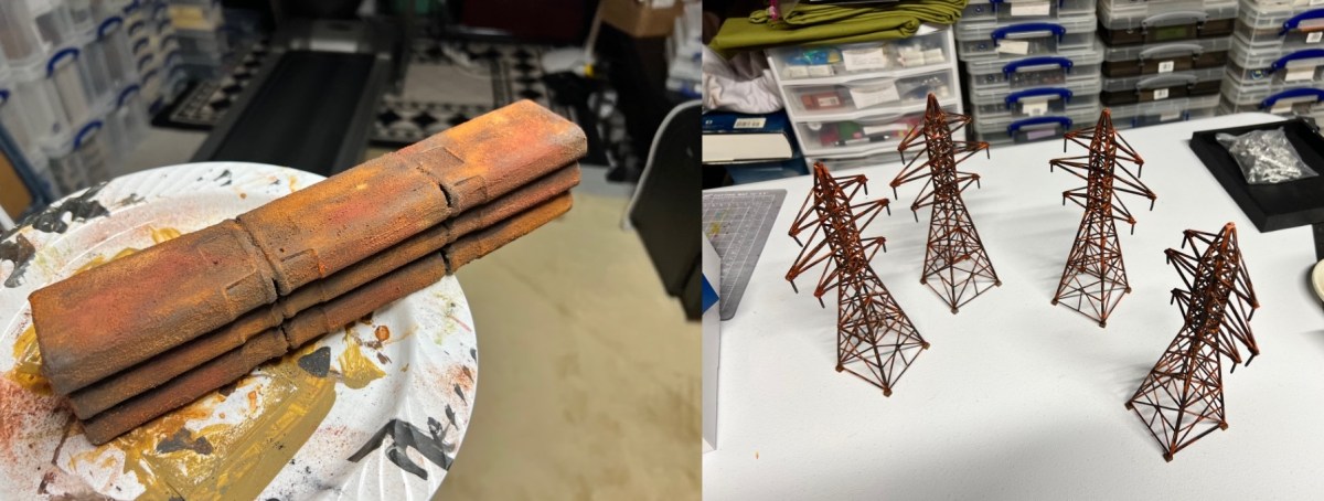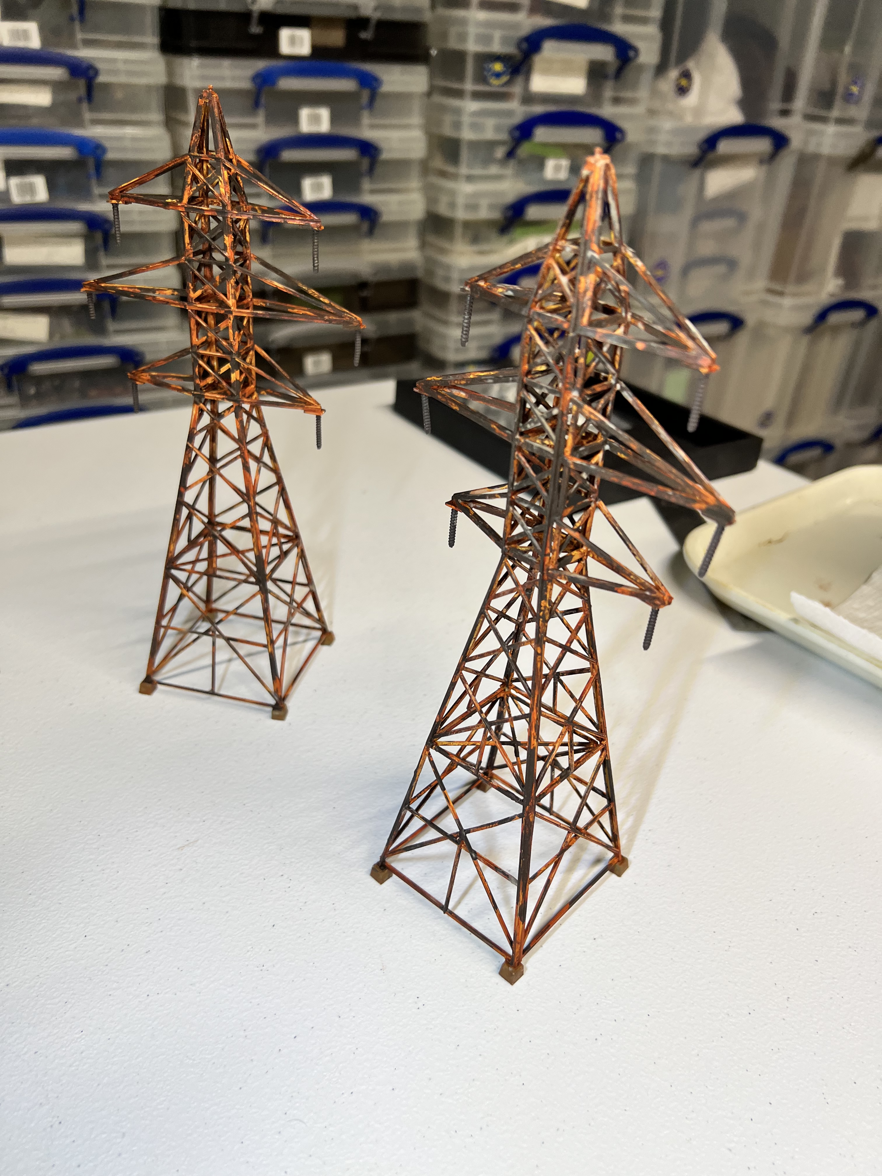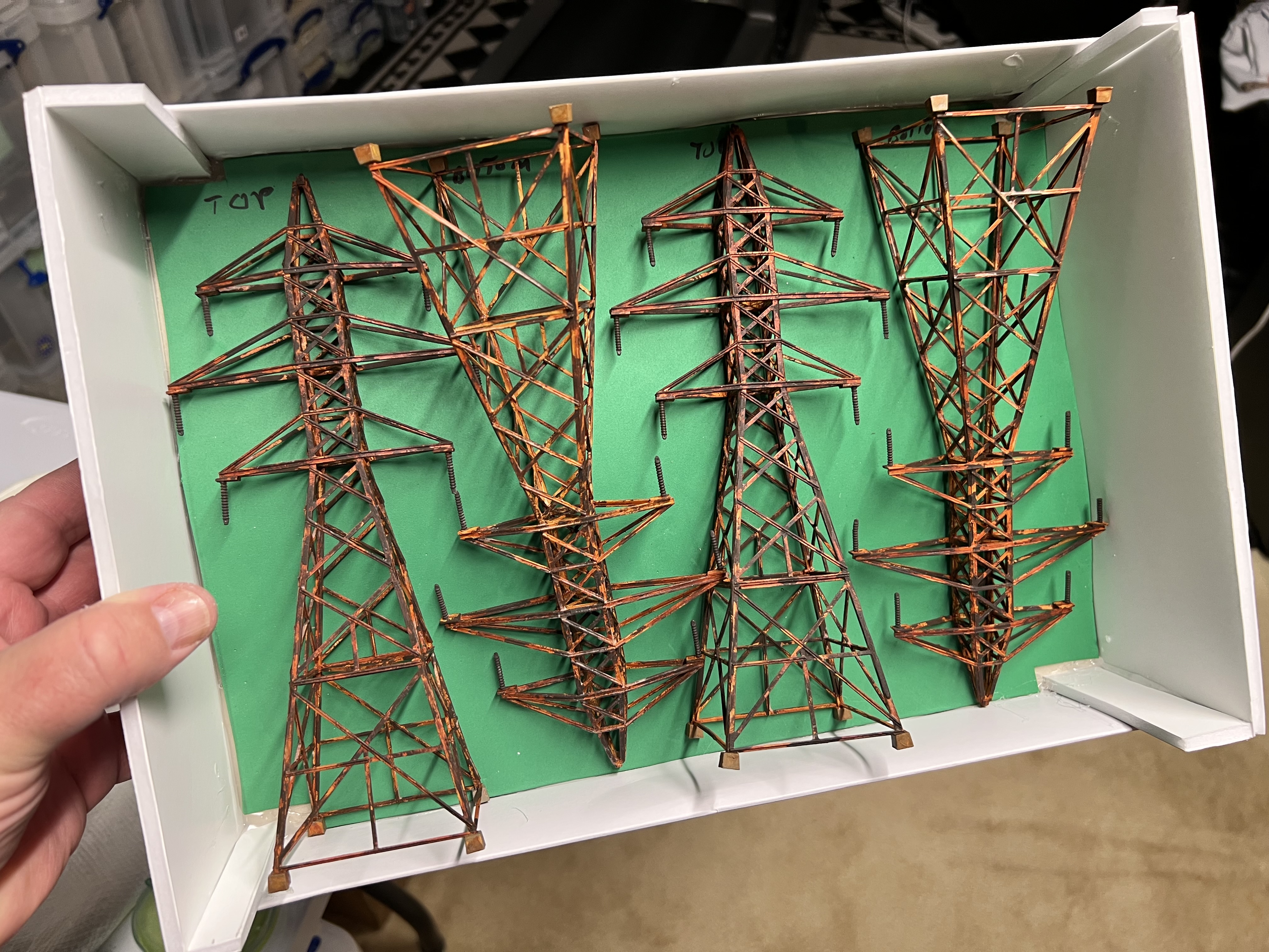 I thought transmission towers – rusty ones – would be great in that role. I found a railroad terrain kit on eBay. It was HO scale. It would go well with the other pieces of rusty fun. These were “Walther’s Cornerstone Four Transmission Towers”.
