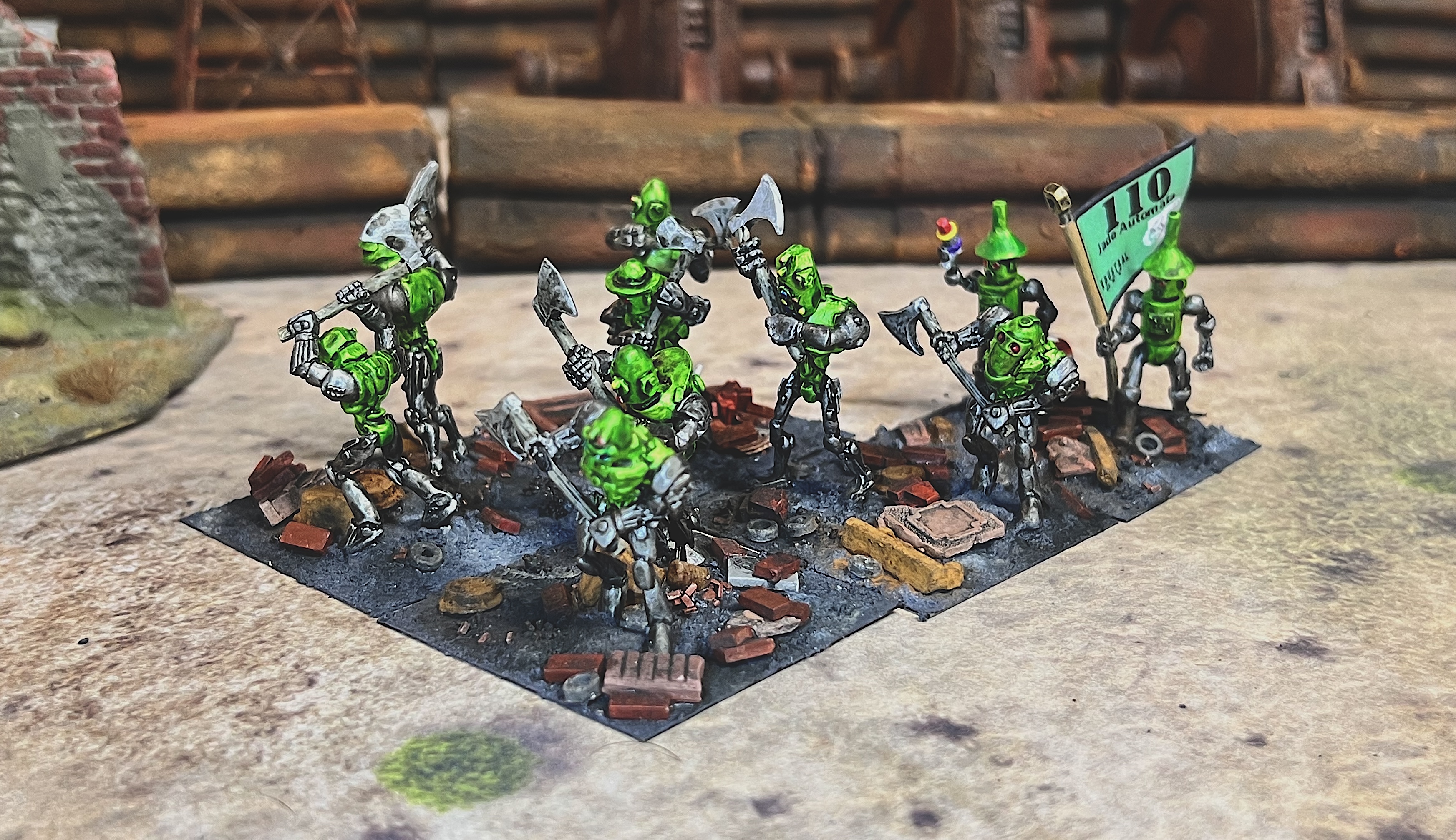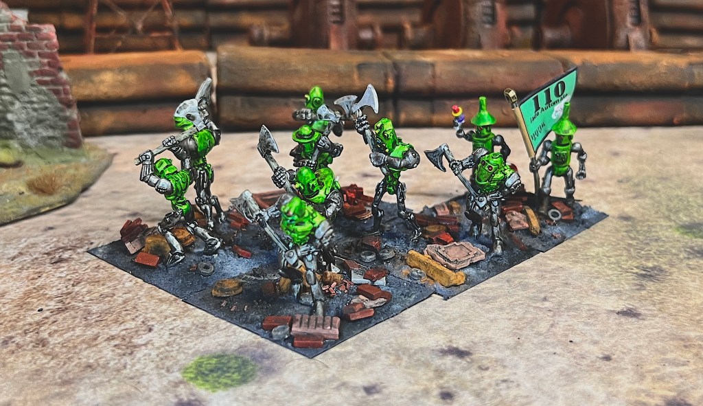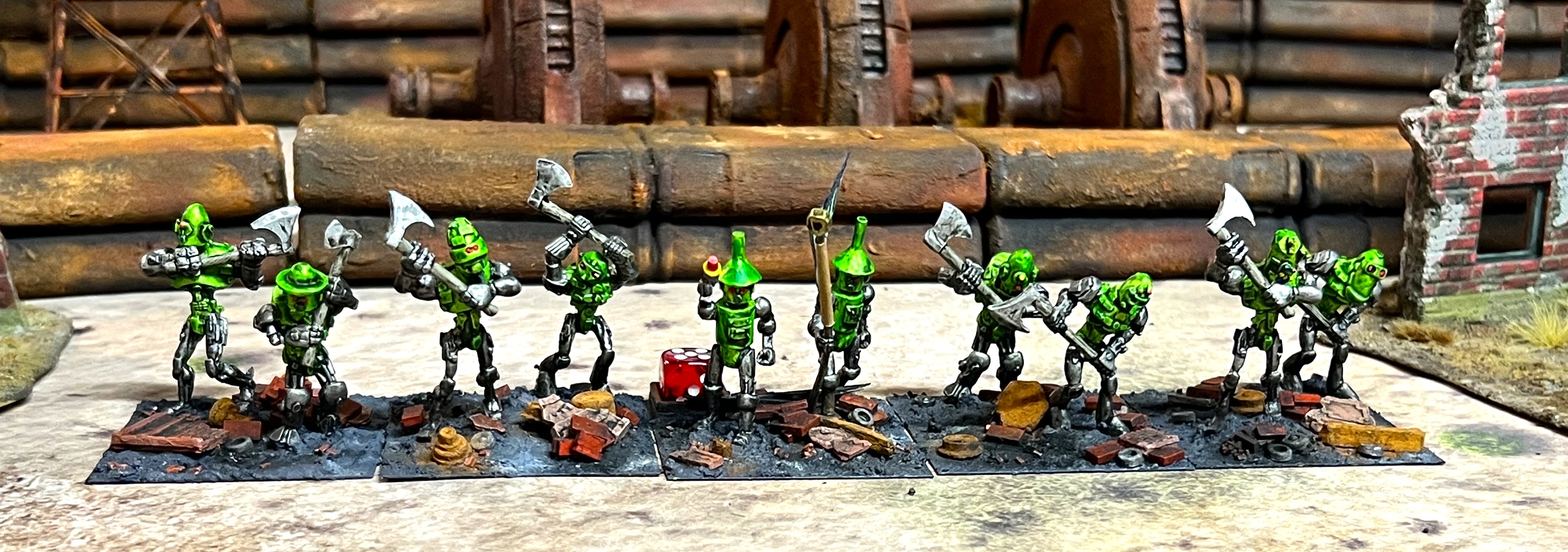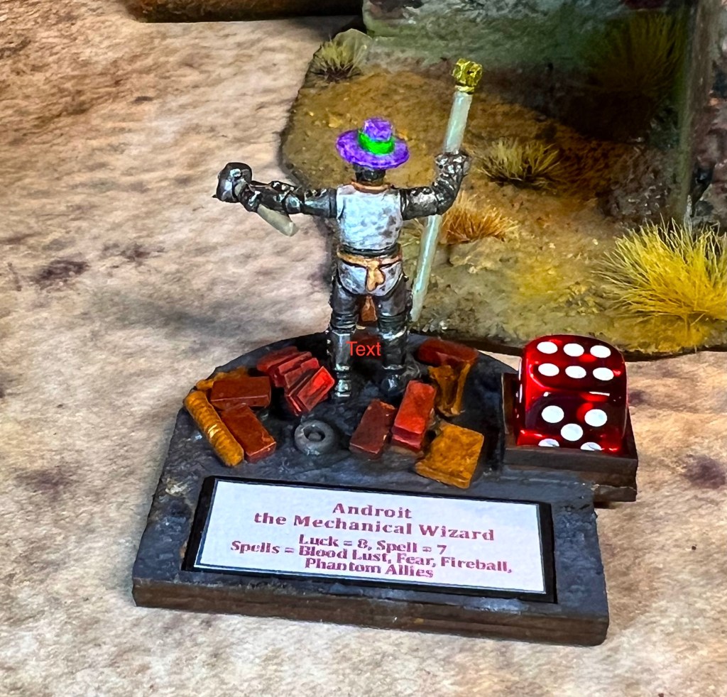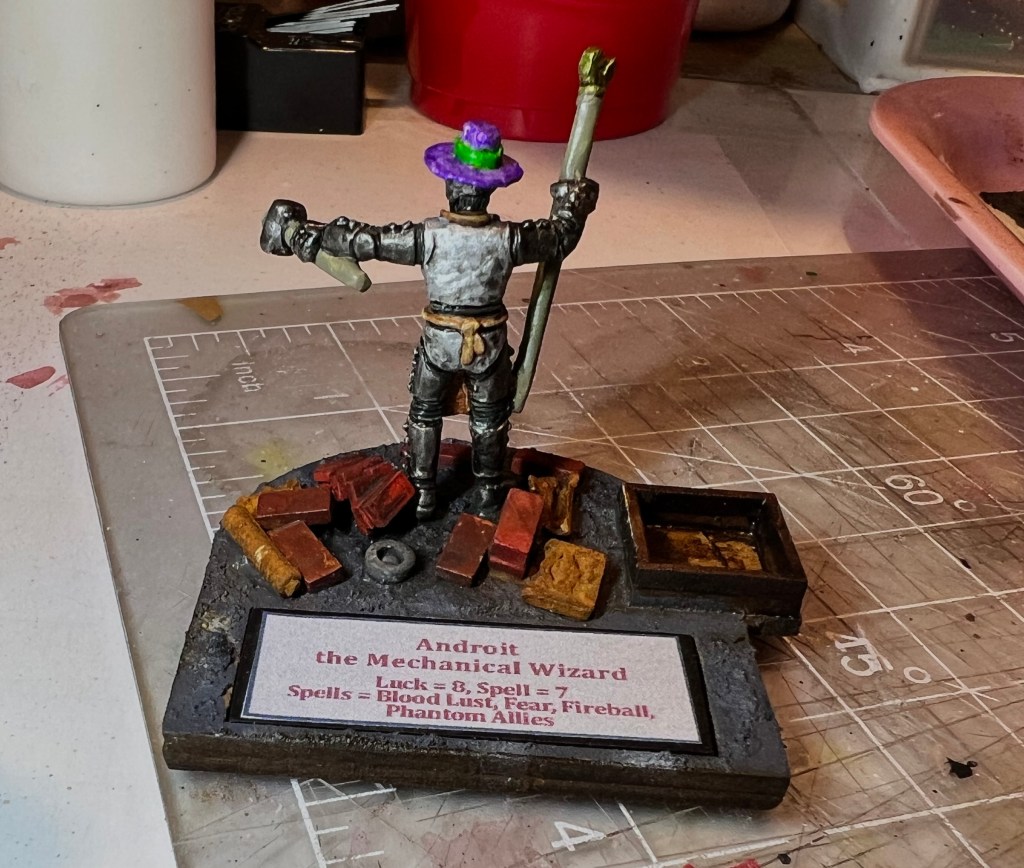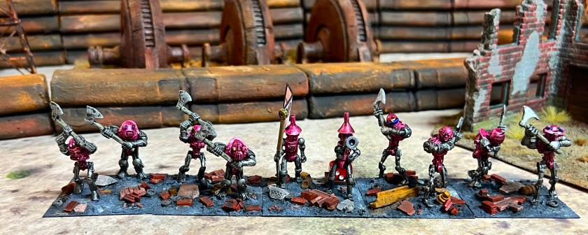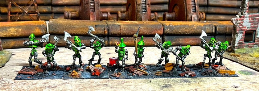 The Mechanical Men would need help in 2026 defending against marauding Munchkins. They would also need help chasing them down as they attempt to steal technological secrets. I chose to build and paint up two regiments of axemen (OZZ-511). Additionally, I chose two regiments armed with napalm blasters (OZZ-539 – not sharing a link as the picture is incorrect on the website). I also had a mechanical wizard, Androit (OZZ-543).