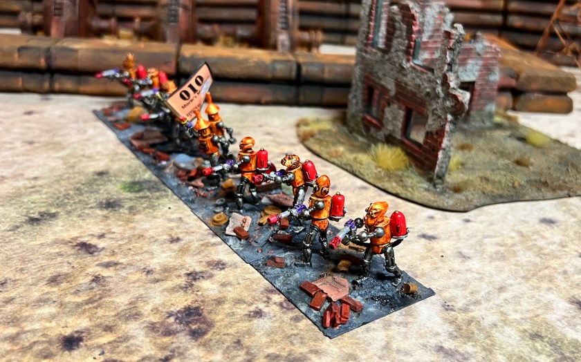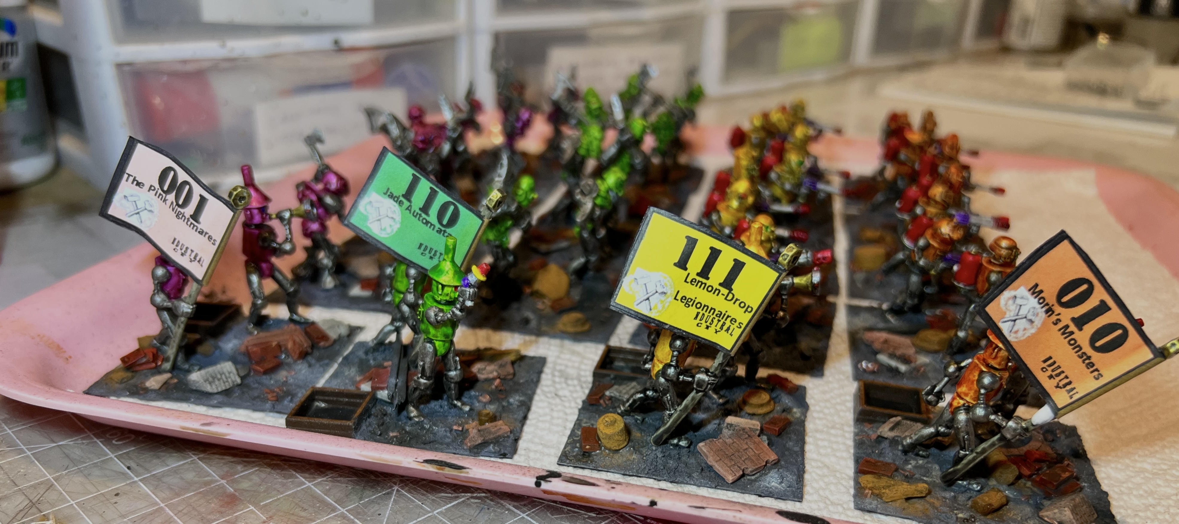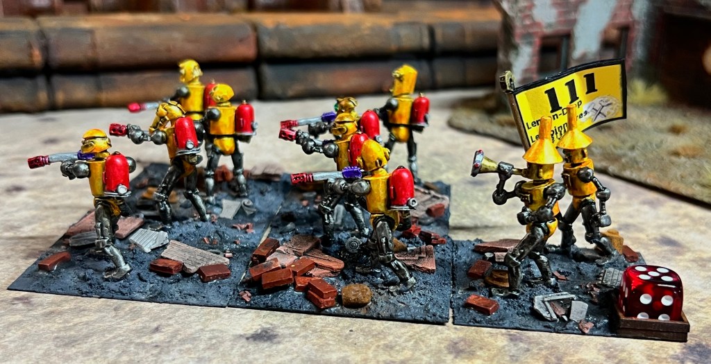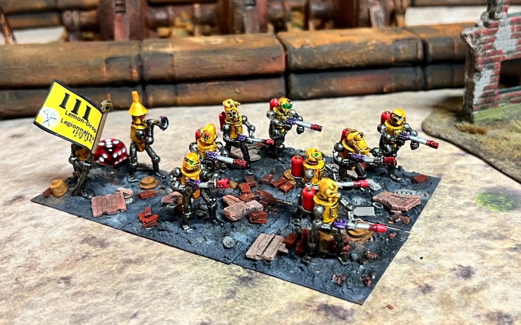 The two napalm blaster regiments would be yellow-themed (“The Lemon Drop Legionnaires”) and orange-themed (Morin’s Monsters). Buck edited his flags for me and named that last one so I just had to give that moniker!