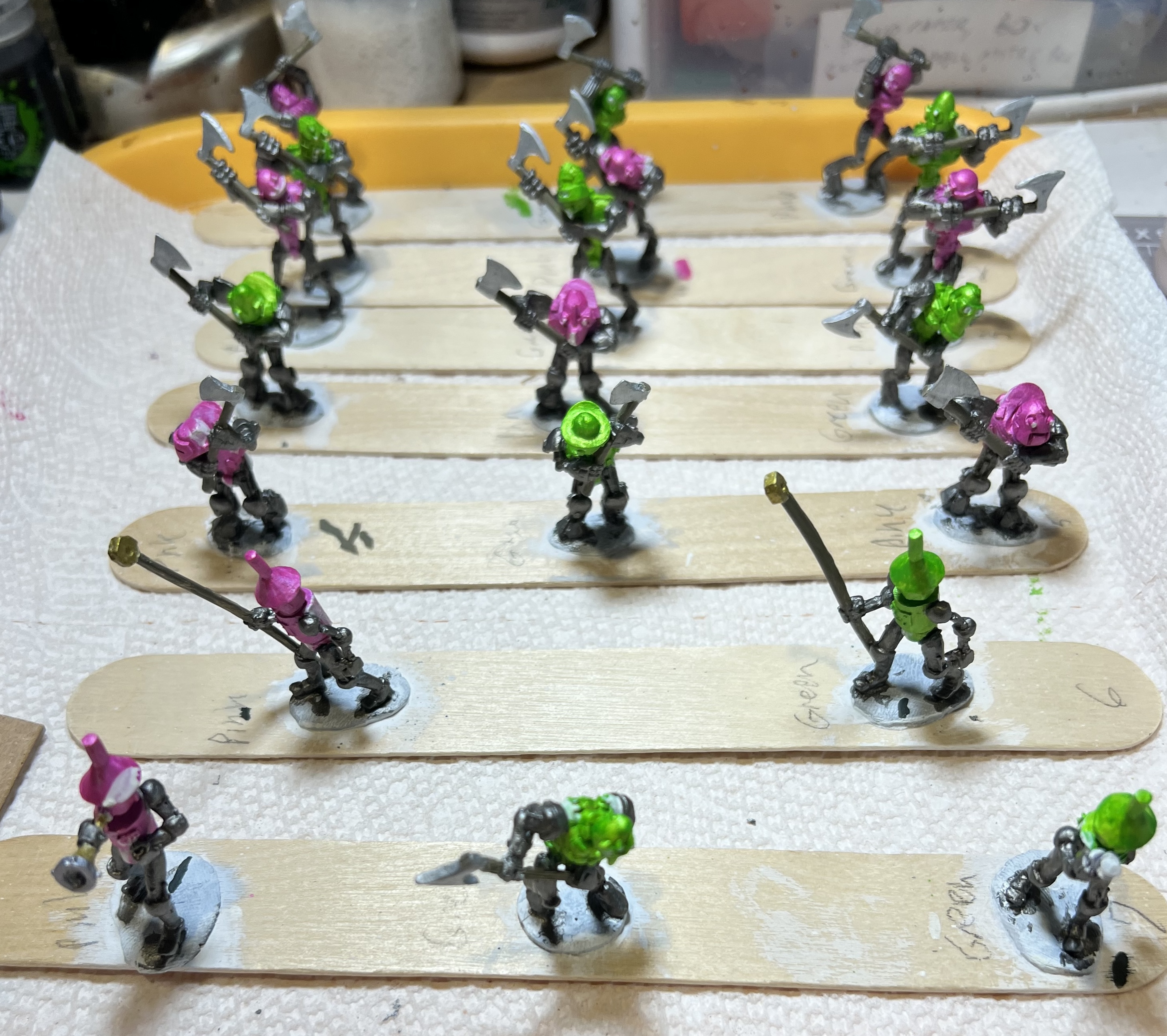 I wanted to give these bad bots a colorful metallic shine. To that end, I experimented by mixing Vallejo “Metallic Medium” with Army Painter Speed and Citadel Contrast Paints. I even tried this with a few of the 1.0 versions that have a reputation for “bleeding”. I am happy to report that no bleeding occurred with this combination.