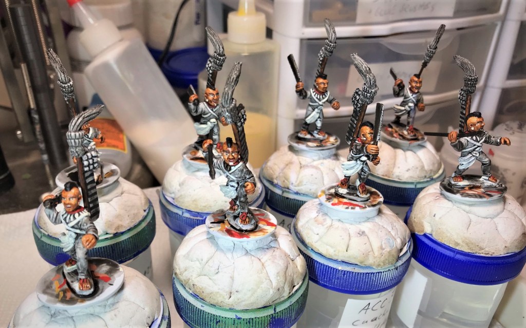 - Aztec Warrior Priests (painted as Tlaxcalans), Ral Partha 42-302, circa 1988 (this post) – 6 figures – 6 Tlaxcalan Warrior Priests