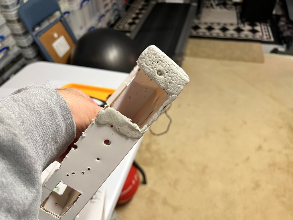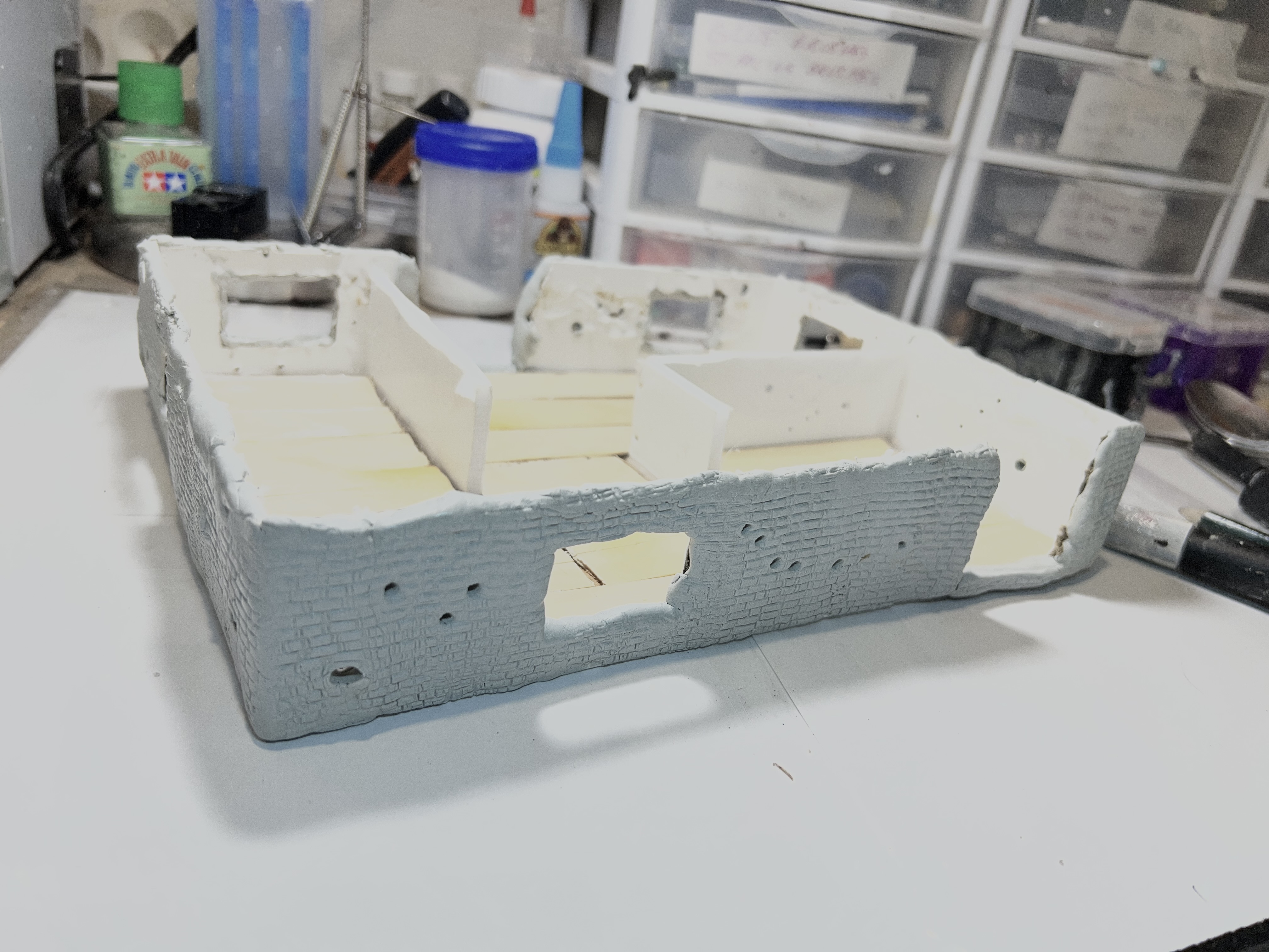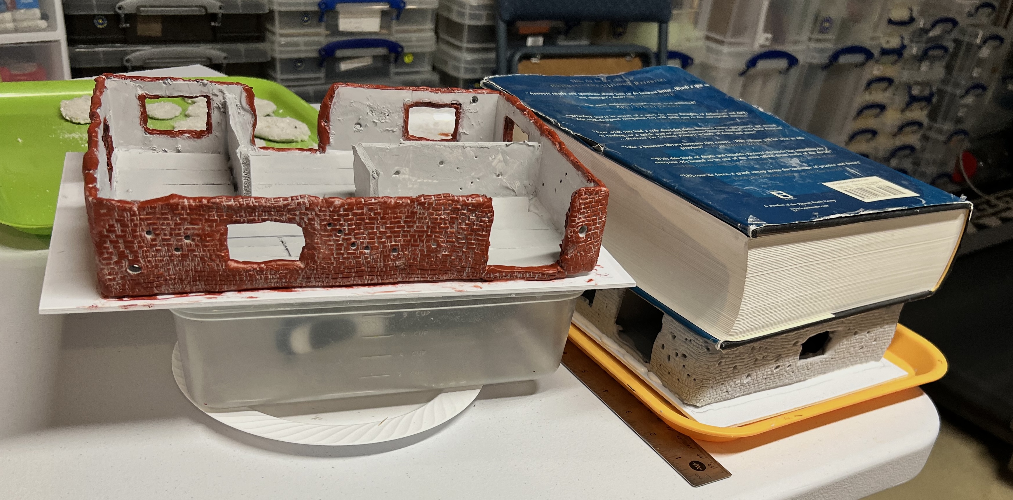 After a day, the Apoxie Sculpt on the first building had cured. But I wanted there to be a small outside rim to it that could hold wreckage and brick debris. While a sheet of polystyrene was gluing to its bottom, I worked on the second building.