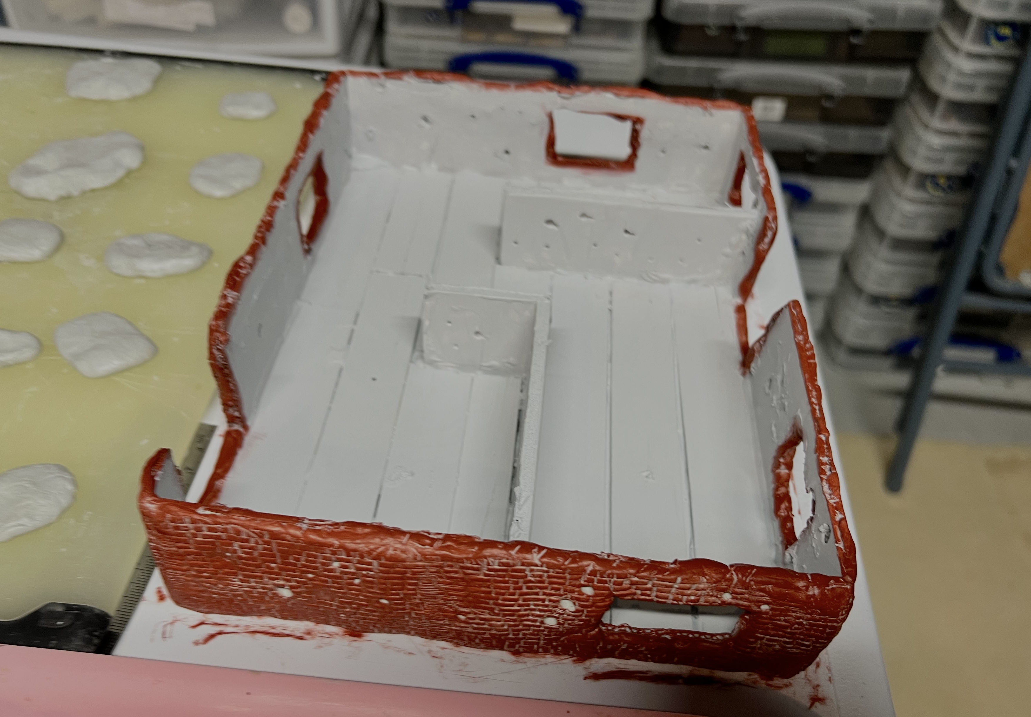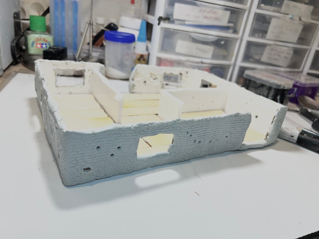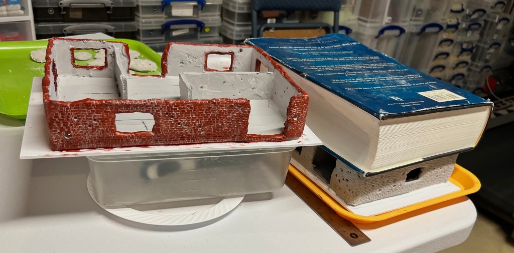 As the first building had cured, I started to paint it. Then I was able to glue a polystyrene base to building number 2.
