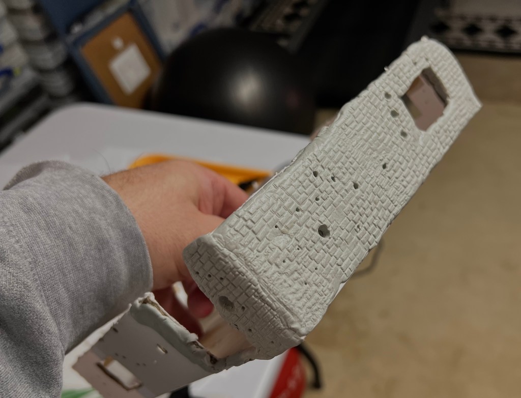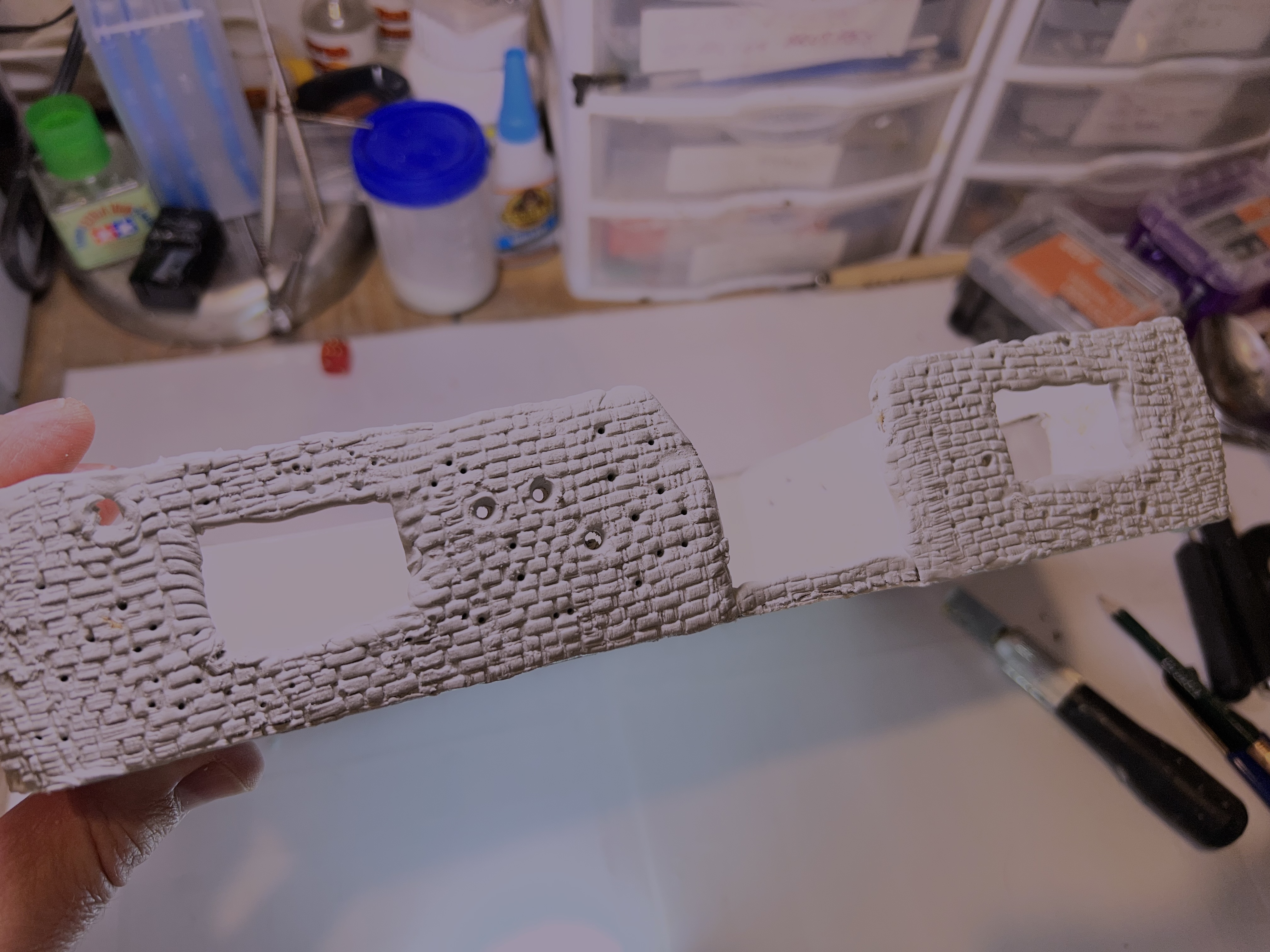 Then it was on to sculpting the outside walls. I did each building separately from here on so as to handle both curing times and to learn as I went as to best practices. Apoxie Sculpt and a Green Stuff World brick roller worked well.