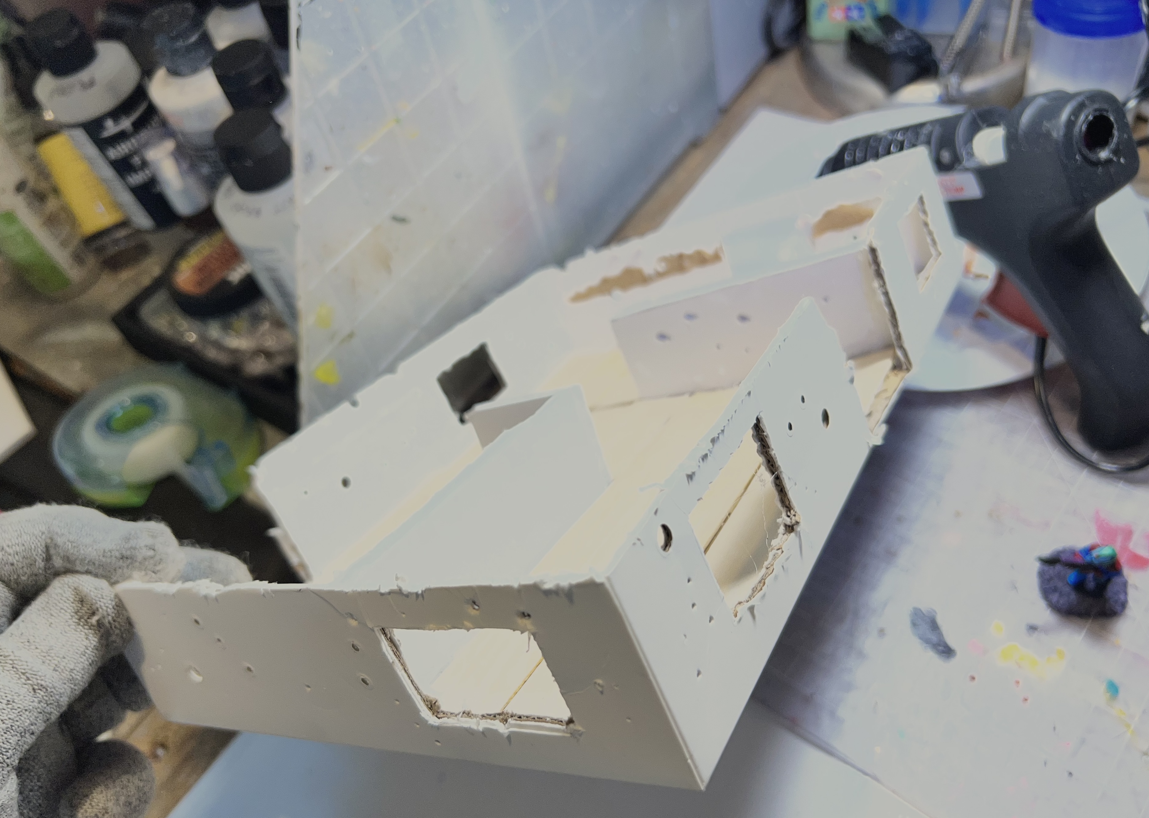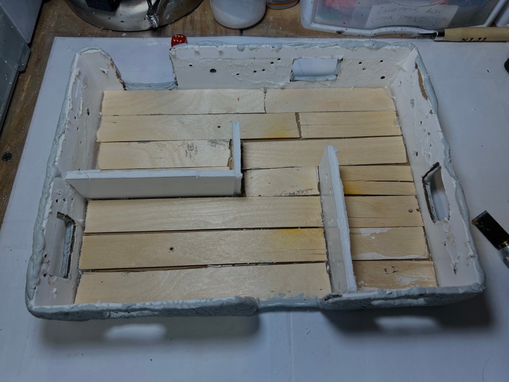 I sawed out windows and doors on both box pieces and made each a bit differently in terms of architectural arrangement. I then hot-glued foam board to make rooms. For flooring, I broke up old popsicle sticks. These I had used previously to mount figures for painting on other projects. Lastly, I drilled out holes in the walls to simulate old bullet holes.